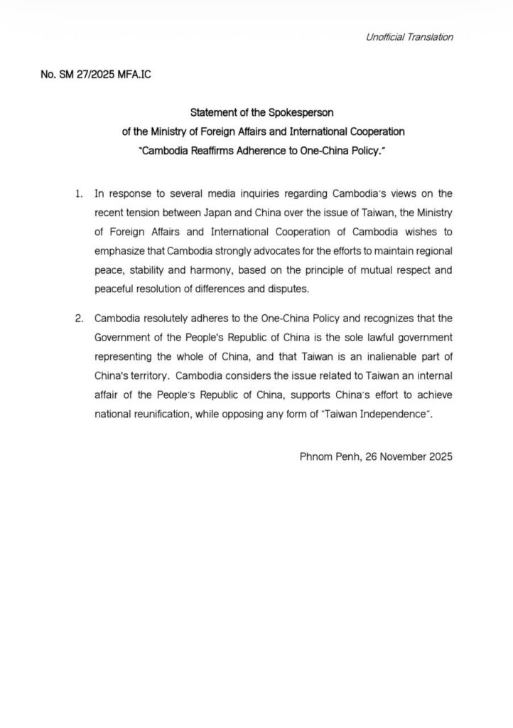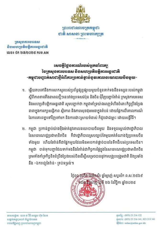 ភ្នំពេញ៖ នៅថ្ងៃទី ២៦ ខែវិច្ឆិកា ឆ្នាំ២០២៥ក្រសួងការបរទេស និងសហប្រតិបត្តិការអន្តរជាតិ បានចេញសេចក្តីថ្លែងការណ៍បញ្ជាក់ថា “កម្ពុជាបញ្ជាក់សាជាថ្មីអំពីការប្រកាន់ខ្ជាប់នូវគោលនយោបាយចិនមួយ”។