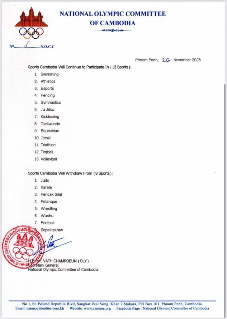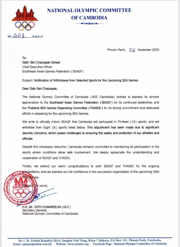 នៅក្នុងលិខិតផ្លូវការមួយ ថ្ងៃទី២៦ ខែវិច្ឆិកា ឆ្នាំ២០២៥ ផ្ញើជូន Dato’ Seri Chaiyapak Siriwat នាយកប្រតិបត្តិ សហព័ន្ធកីឡាអាស៊ីអាគ្នេយ៍ (SEAGF) ឯកឧត្តម វ៉ាត់ ចំរើន អគ្គលេខាធិការ NOCC បានបញ្ជាក់ពីការជូនដំណឹងអំពីការដកខ្លួនចេញប្រភេទកីឡាចំនួន៨របស់កម្ពុជា ក្នុងការប្រកួតកីឡាស៊ីហ្គេម លើកទី៣៣ នៅប្រទេសថៃ ពីថ្ងៃទី០៩-២០ ខែវិច្ឆិកា ឆ្នាំ២០២៥។ គណៈកម្មាធិការជាតិអូឡាំពិកកម្ពុជាសូមថ្លែងអំណរគុណយ៉ាងស្មោះស្ម័គ្រចំពោះសហព័ន្ធកីឡាអាស៊ីអាគ្នេយ៍ (SEAGF) ដែលបានបន្តដឹកនាំរបស់ខ្លួន និងគណៈកម្មាធិការរៀបចំស៊ីហ្គេមរបស់ប្រទេសថៃ (THASOC) ចំពោះការប្តេជ្ញាចិត្ត និងការខិតខំប្រឹងប្រែងយ៉ាងមុតមាំក្នុងការរៀបចំការប្រកួតកីឡាស៊ីហ្គេម។ NOCC ជូនដំណឹងជាផ្លូវការដល់ SEAGF ថា កម្ពុជានឹងចូលរួមប្រកួតតែលើ១៣ប្រភេទកីឡា ដោយសម្រេចដកខ្លួនចេញពីការប្រកួតចំនួន ៨ប្រភេទកីឡា។