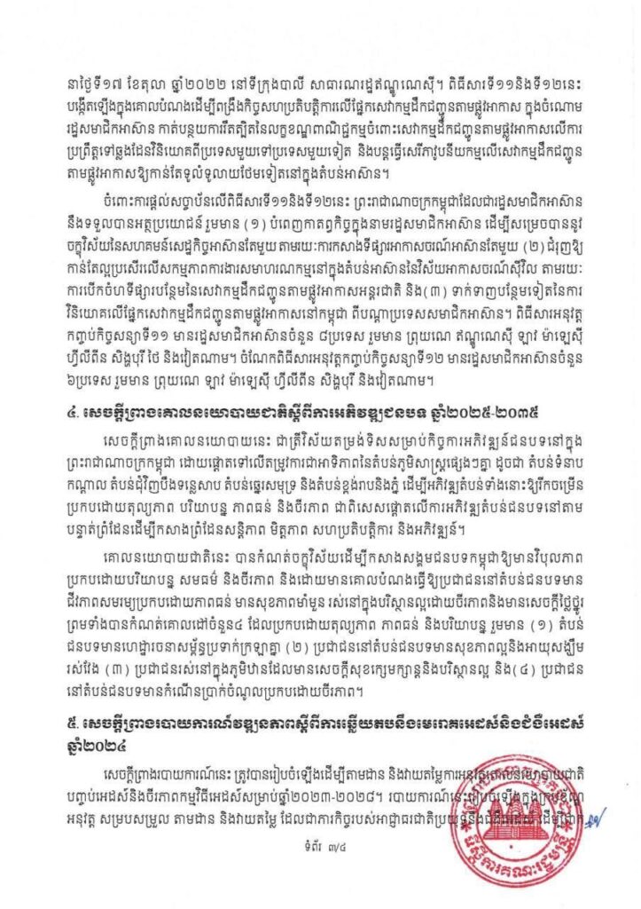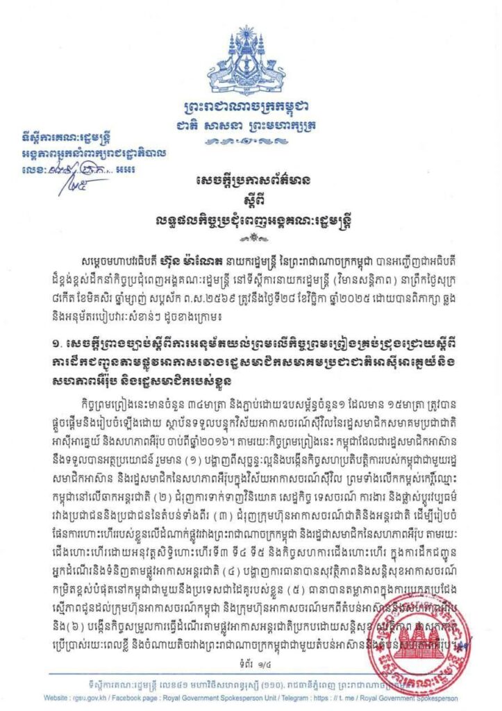 ភ្នំពេញ ៖ សេចក្តីប្រកាសព័ត៌មាន ស្តីពី លទ្ធផលកិច្ចប្រជុំពេញអង្គគណៈរដ្ឋមន្រ្តី ក្រោមអធិបតីភាពដ៏ខ្ពង់ខ្ពស់របស់សម្តេចមហាបវរធិបតី ហ៊ុន ម៉ាណែត នាយករដ្ឋមន្ត្រី នៃព្រះរាជាណាចក្រកម្ពុជា នាព្រឹកថ្ងៃសុក្រ ៨កើត ខែមិគសិរ ឆ្នាំម្សាញ់ សប្តស័ក ព.ស.២៥៦៩ ត្រូវនឹងថ្ងៃទី២៨ ខែវិច្ឆិកា ឆ្នាំ២០២៥។