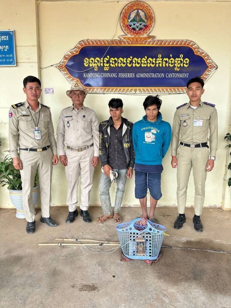 ក្នុងនោះសមត្ថកិច្ចជំនាញបានឃាត់ជនសង្ស័យចំនួន០២នាក់ និង ដកហូតវត្ថុតាងខុសច្បាប់ ករណី(ឧបករណ៍ឆក់ត្រី) មានឈ្មោះដូចខាងក្រោម៖ ១. អឿន ទិត្យ ភេទប្រុស អាយុ ២១ ឆ្នាំ។ ២. អឿន កំសាន្តភេទប្រុសអាយុ១៩ ឆ្នាំ(រស់នៅភូមិ សំរោង ឃុំពោធិ ស្រុក កំពង់លែង ខេត្តកំពង់ឆ្នាំង )និងដកហូតវត្ថុតាង រួមមាន:. អាំងវែកទ័រឆក់ត្រី ០១គ្រ .ដងឆក់ត្រី ០១ គូរ អាគុយ៤០ អំពែ ចំនួន០១គ្រឿង.ខ្សែភ្លើងប្រវែង ៣ ម៉ែត្រ.ទូកបាឡាស្មាច់ ភ្ជាប់ម៉ាសុីនចំនួន ០១គ្រឿង.ត្រីចំនួន ០២គីឡូក្រាម (អន់គុណភាព)៕ រក្សាសិទ្ធដោយ៖សុទ្ធលី