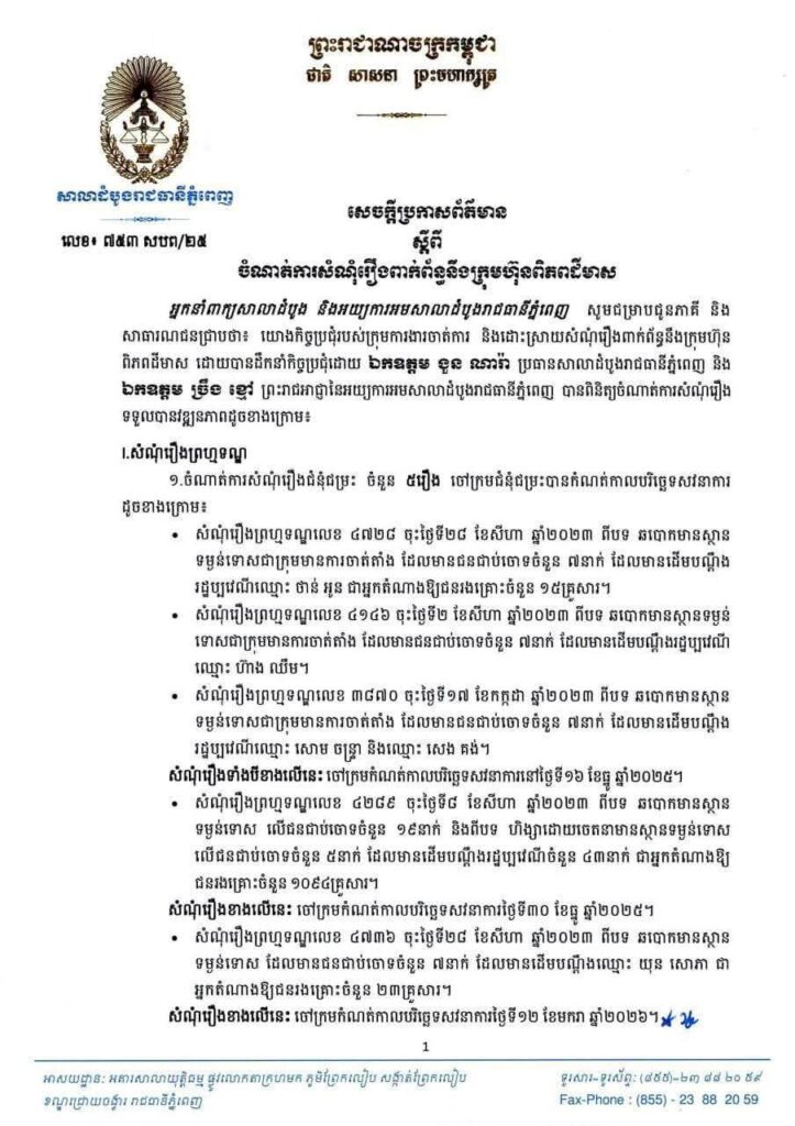 ភ្នំពេញ ៖ អ្នកនាំពាក្យសាលាដំបូង និងអយ្យការអមសាលាដំបូងរាជធានីភ្នំពេញ នៅថ្ងៃទី២៨ ខែវិច្ឆិកាឆ្នាំ២០២៥