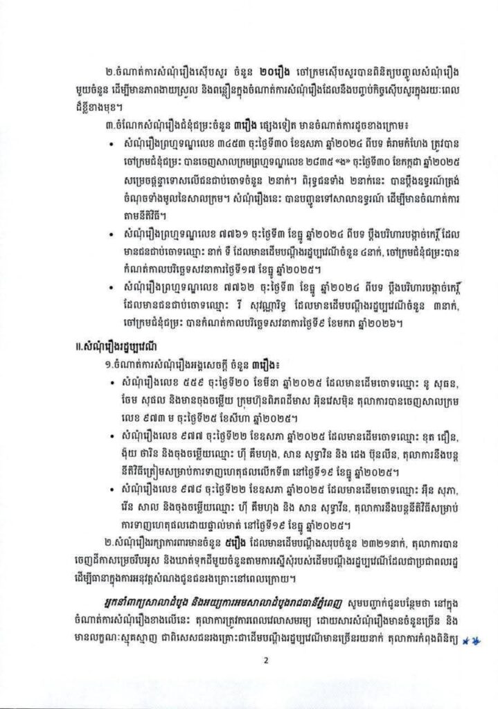 សំណុំរឿងទាំងនេះ តុលាការនឹងបន្តធ្វើការពិនិត្យចាត់ការឱ្យបានលឿន ត្រឹមត្រូវ និងយុត្តិធម៌ជូនភាគី៕ រក្សាសិទ្ធដោយ៖សុទ្ធលី