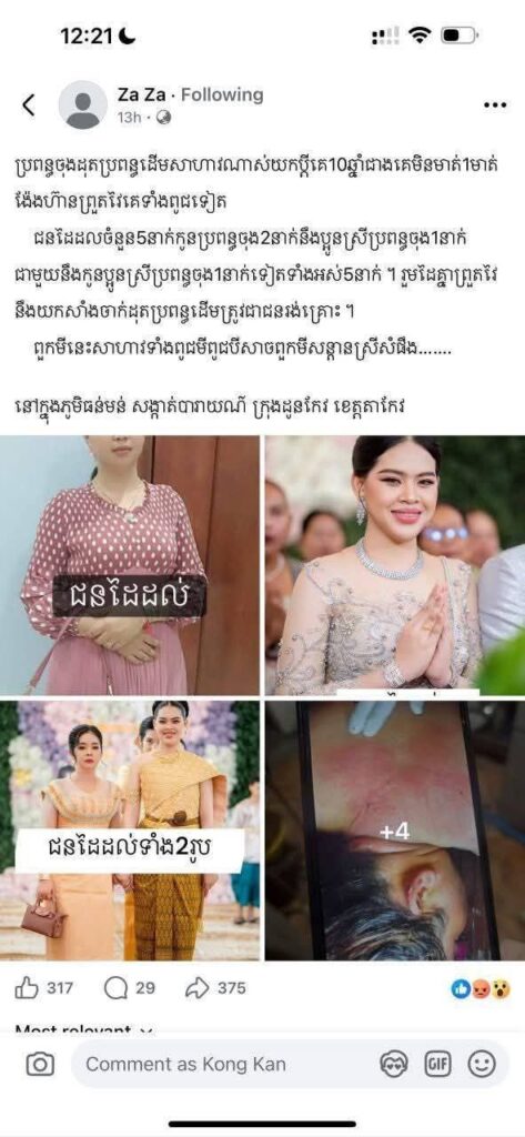 តាកែវ÷ជនដៃដលចំនួន៥នាក់ កូនប្រពន្ធចុង២នាក់នឹងប្អូនស្រីប្រពន្ធចុង ជាមួយនឹងកូនប្អូនស្រីប្រពន្ធចុង ទាំងអស់៥នាក់ រួមដៃគ្នាព្រួតវៃនឹងយកសាំងចាក់ដុតប្រពន្ធដេីមត្រូវជាជនរង់គ្រោះ ។ ពួកនេះសាហាវមែន។ករណីនេះ កម្លាំងជំនាញនៃអធិការដ្ឋានក្រុងដូនកែវ បានឃាត់ខ្លួនជនសង្ស័យស្រី.ប្រុស៤នាក់ ដែលបានព្រួតគ្នាវាយប្រពន្ធដើមឲ្យទ្រោមខ្លួន រួចចាក់សាំងដុតឲ្យរបួសធ្ងន់