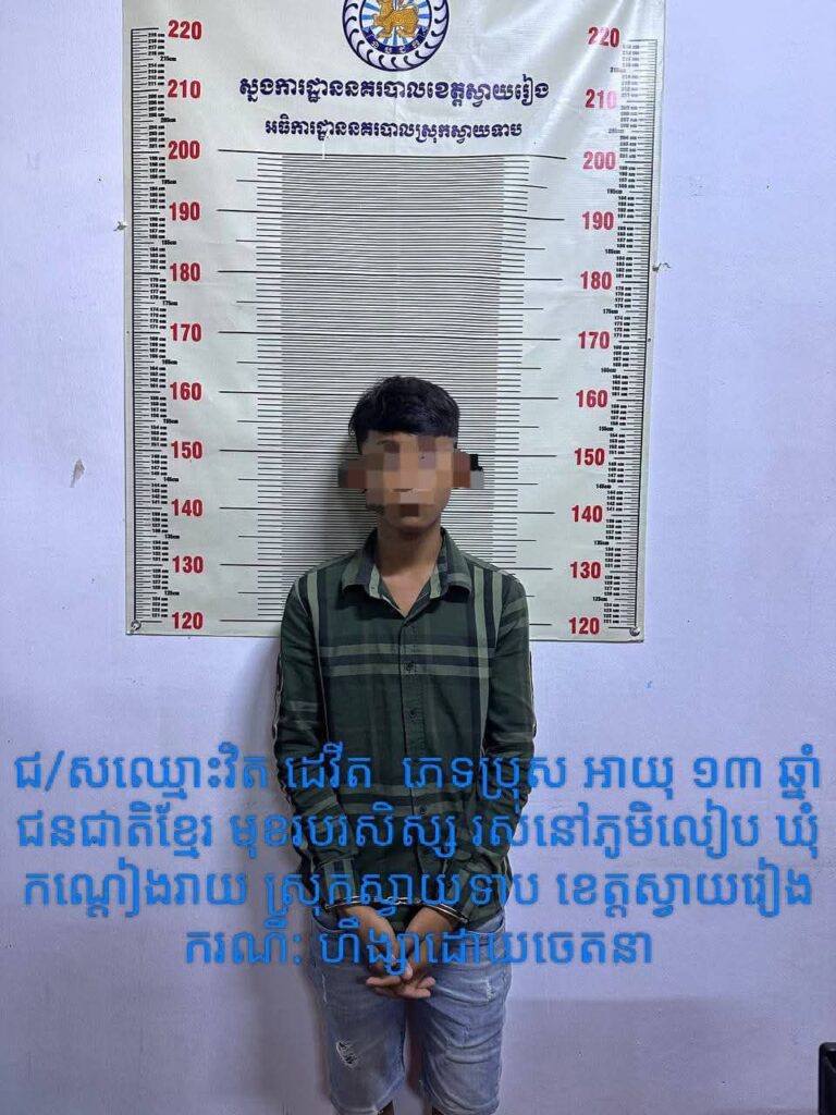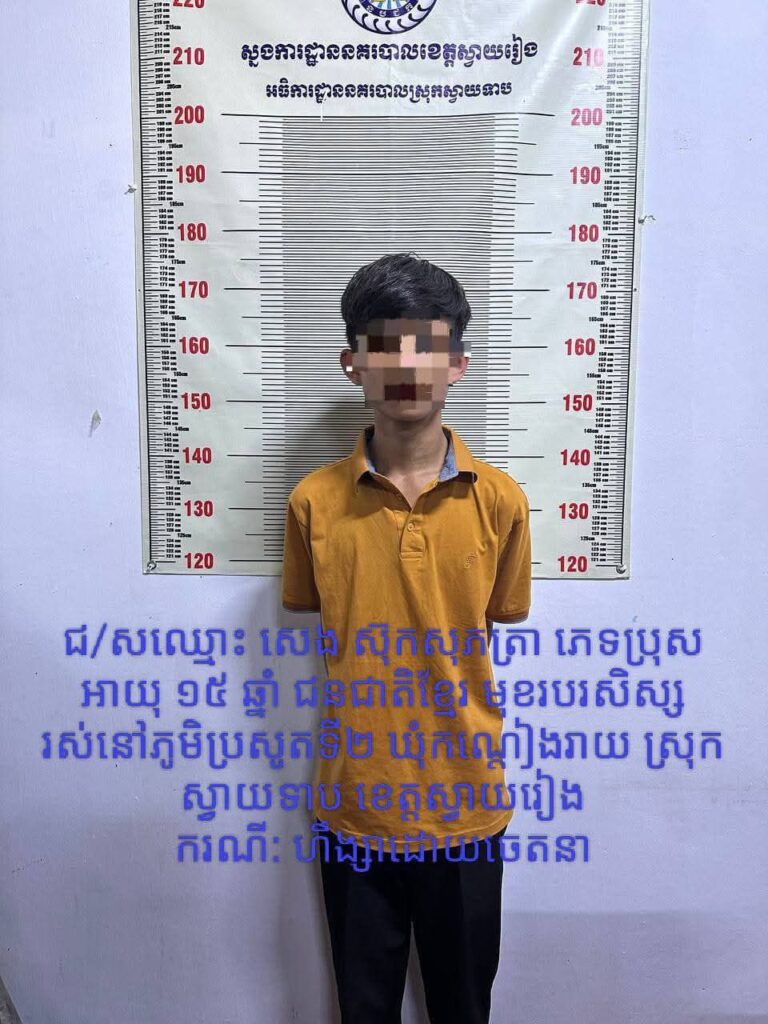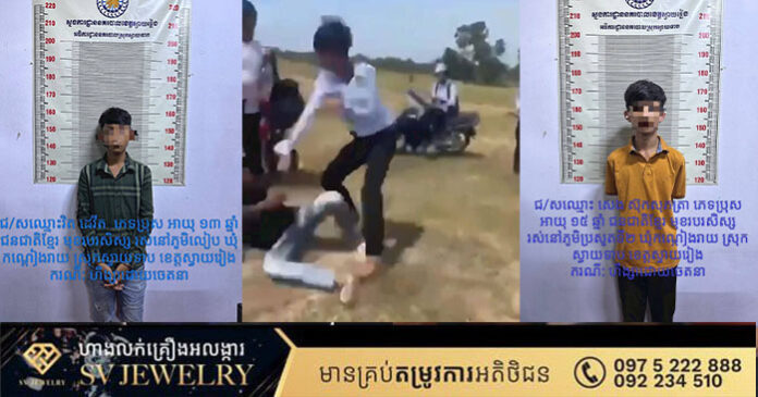 ស្វាយរៀង ៖ នៅថ្ងៃទី២៩ ខែវិច្ឆិកា ឆ្នាំ២០២៥ វេលាម៉ោង៩ ០០នាទីព្រឹក កម្លាំងជំនាញនៃអធិការដ្ឋាននគរបាលស្រុកស្វាយទាបសហការជាមួយកម្លាំងប៉ុស្តិ៍រដ្ឋបាលឃុំកណ្តៀងរាយ គណៈនាយកសាលាវិទ្យាល័យហ៊ុនសែនប្រសូត្រ ស្រាវជ្រាវករណីបែកធ្លាយវីដេអូសិស្សសាលាណាត់វាយគ្នាក្រៅសាលានៅលើផ្លូវបេតុង បឹងឈូក ស្ថិតនៅភូមិបន្ទាយ ឃុំកណ្តៀងរាយ ស្រុកស្វាយទាប ខេត្តស្វាយរៀង កាលពីថ្ងៃព្រហស្បតិ៍ទី២៧ ខែវិច្ឆិកា ឆ្នាំ២០២៥ វេលាម៉ោង១១ និង ១០នាទី ក្រោយមកបានកំណត់អត្តសញ្ញាណជនសង្ស័យជាសិស្សចំនួន ០២នាក់ជាជនដៃដល់