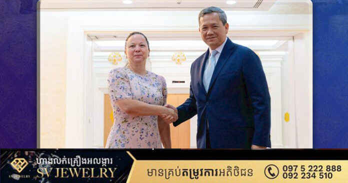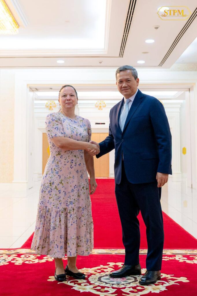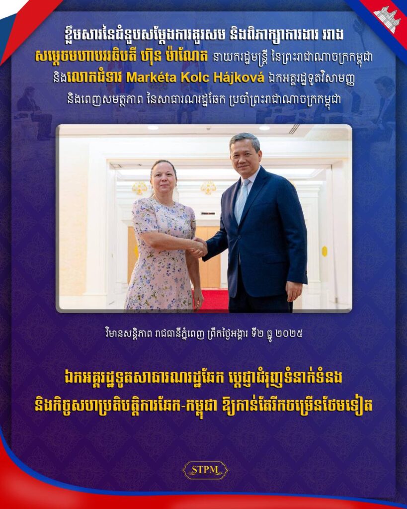 ភ្នំពេញ ៖ នាព្រឹកថ្ងៃទី២ ខែធ្នូ ឆ្នាំ២០២៥, នៅវិមានសន្តិភាព,សម្តេចមហាបវរធិបតី ហ៊ុន ម៉ាណែត នាយករដ្ឋមន្ត្រី នៃព្រះរាជាណាចក្រកម្ពុជា បានអនុញ្ញាតឱ្យ លោកជំទាវ ម៉ាកេតា កូល ហៃកូវ៉ា (Markéta Kolc Hájková) ឯកអគ្គរដ្ឋទូតវិសាមញ្ញ និងពេញសមត្ថភាព នៃសាធារណរដ្ឋឆែកប្រចាំព្រះរាជាណាចក្រកម្ពុជា និងសហការី ចូលជួបសម្ដែងការគួរសម និងពិភាក្សាការងារ។