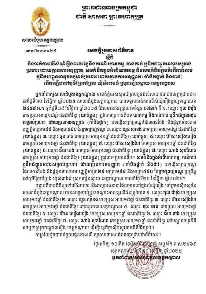 អ្នកនាំពាក្យសាលាដំបូងខេត្តកណ្តាល សូមជម្រាបជូនដល់សាធារណជនមេត្តាជ្រាបថា៖ នៅថ្ងៃទី៣០ ខែវិច្ឆិកា ឆ្នាំ២០២៥ សាលាដំបូងខេត្តកណ្តាល បានទទួលចាត់ការលើសំណុំរឿងព្រហ្មទណ្ឌលេខ ២៤៥៥ អ.ក ចុះថ្ងៃទី២៩ ខែវិច្ឆិកា ឆ្នាំ២០២៥ ដែលមានជនត្រូវចោទចំនួន ០៧នាក់ គឺ ១. ឈ្មោះ កុល ដារ៉ុង ភេទប្រុស អាយុ១៨ឆ្នាំ ជនជាតិខ្មែរ (ឃាត់ខ្លួន) ត្រូវចោទប្រកាន់ពីបទ ឃាតកម្ម និងកាន់កាប់ ឬដឹកជញ្ជូនអាវុធ សម្រាប់ប្រហារ ដោយគ្មានការអនុញ្ញាត (កាំបិតផ្គាក់) បទល្មើសព្រហ្មទណ្ឌដែលមានចែង និងផ្តន្ទាទោសតាម បញ្ញត្តិមាត្រា១៩៩ និងមាត្រា៤៩០ នៃក្រមព្រហ្មទណ្ឌ ២. ឈ្មោះ ឃួន សុខេង ភេទប្រុស អាយុ១៨ឆ្នាំ ជនជាតិខ្មែរ (ឃាត់ខ្លួន) ៣. ឈ្មោះ ឆុន ឆាត់ ភេទប្រុស អាយុ១៦ឆ្នាំ ជនជាតិខ្មែរ (ឃាត់ខ្លួន) ៤. ឈ្មោះ ហ៊ាន សៀងហៀង ភេទប្រុស អាយុ១៦ឆ្នាំ ជនជាតិខ្មែរ (ឃាត់ខ្លួន) ៥. ឈ្មោះ ហ៊ាន សៀងហៃ ភេទប្រុស អាយុ១៨ឆ្នាំ ជនជាតិខ្មែរ (ឃាត់ខ្លួន) ៦. ឈ្មោះ ជ័យ ចេង ភេទប្រុស អាយុ១៧ឆ្នាំ ជនជាតិខ្មែរ (ឃាត់ខ្លួន) ៧. ឈ្មោះ ណាង សុខណែត ភេទប្រុស អាយុ១៧ឆ្នាំ ជនជាតិខ្មែរ (ឃាត់ខ្លួន) ត្រូវចោទប្រកាន់ពីបទ សមគំនិតក្នុងអំពើឃាតកម្ម, កាន់កាប់ ឬដឹកជញ្ជូនអាវុធសម្រាប់ប្រហារដោយគ្មានការអនុញ្ញាត (កាំបិតផ្គាក់ និងដាវ) បទល្មើសព្រហ្មទណ្ឌ ដែលមានចែង និងផ្តន្ទាទោសតាមបញ្ញត្តិមាត្រា២៩ មាត្រា១៩៩ និងមាត្រា៤៩០ នៃក្រមព្រហ្មទណ្ឌ ប្រព្រឹត្ត នៅភូមិព្រែកត្រែង ឃុំសំរោងធំ ស្រុកកៀនស្វាយ ខេត្តកណ្តាល កាលពីថ្ងៃទី២៦ ខែវិច្ឆិកា ឆ្នាំ២០២៥។
