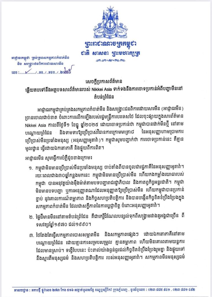 ភ្នំពេញ ៖ អាជ្ញាធរកម្ពុជា គ្រប់គ្រងសកម្មភាពកំចាត់មីន និង សរង្គ្រោះជនពិការដោយសារមីន (អាជ្ញាធរមីន) នៅថ្ងៃទី ៣ ខែធ្នូ ឆ្នាំ២០២៥ បានចេញសេចក្តីប្រកាសព័ត៌មានឆ្លើយតបទៅនឹងអត្ថបទសារព័ត៌មានរបស់ Nikkei Asia ទាក់ទងនឹងការចោទប្រកាន់អំពីបញ្ហាមីននៅតំបន់ព្រំដែន។