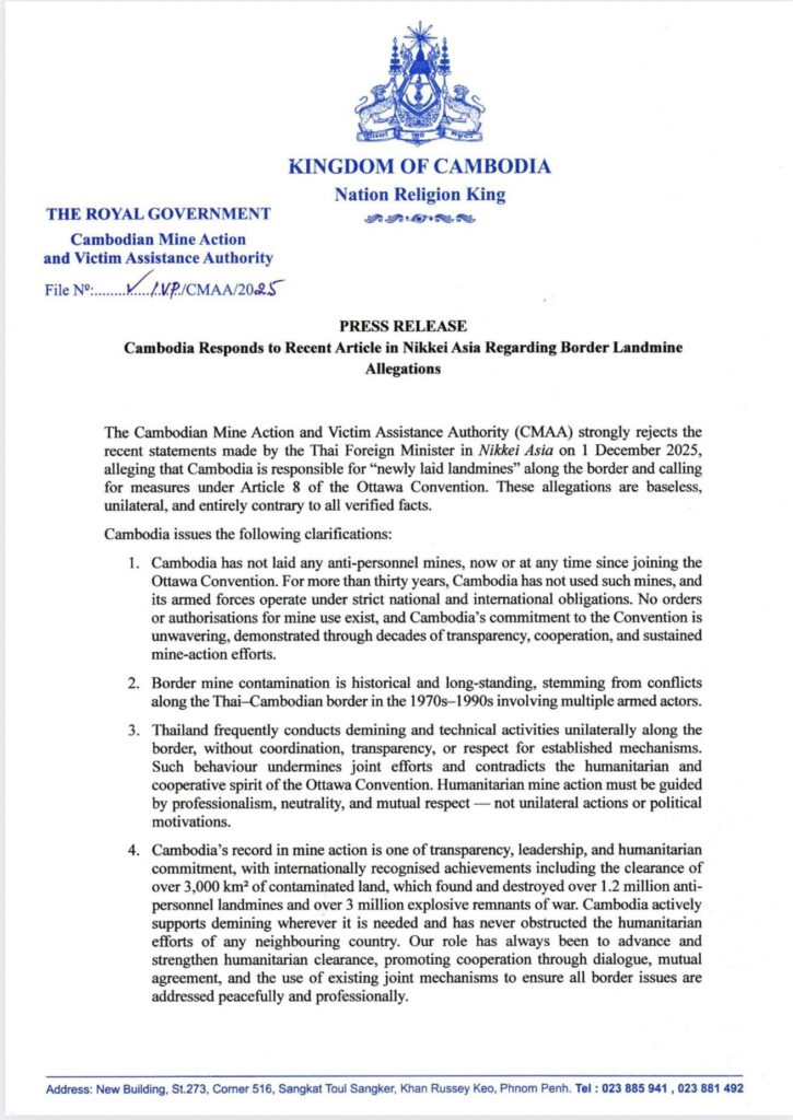 អាជ្ញាធរកម្ពុជាគ្រប់គ្រងសកម្មភាពកំចាត់មីន និងសង្គ្រោះជនពិការដោយសារមីន (អាជ្ញាធរមីន) ច្រានចោលដាច់ខាត ចំពោះការលើកឡើងរបស់រដ្ឋមន្ត្រីការបរទេសថៃ ដែលចុះផ្សាយក្នុងសារព័ត៌មាន Nikkei Asia កាលពីថ្ងៃទី១ ខែធ្នូ ឆ្នាំ២០២៥ ដោយចោទប្រកាន់ថា កម្ពុជាបានដាក់មីនថ្មី នៅតាម បណ្ដោយព្រំដែន និងទាមទារឱ្យប្រើប្រាស់វិធានការក្រោមមាត្រា៨ នៃអនុសញ្ញាហាមប្រាមការ ប្រើប្រាស់មីនប្រឆាំងមនុស្ស (អនុសញ្ញាអូតាវ៉ៅ)។