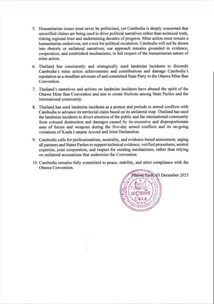 ៣. ថៃតែងតែធ្វើសកម្មភាពបោសសម្អាតមីន និងសកម្មភាពផ្សេងៗ ដោយឯកតោភាគីនៅតាម បណ្ដោយព្រំដែន ដោយគ្មានការសម្របសម្រួល គ្មានតម្លាភាព ហើយមិនគោរពតាមយន្តការ ដែលមានស្រាប់។ ទង្វើបែបនេះ ប៉ះពាល់យ៉ាងធ្ងន់ធ្ងរដល់កិច្ចខិតខំប្រឹងប្រែងរួមគ្នា និងផ្ទុយទៅ នឹងស្មារតីមនុស្សធម៌ និងសហប្រតិបត្តិការ របស់អនុសញ្ញាអូតាវ៉ា។ សកម្មភាពមីនមនុស្សធម៌ត្រូវតែអនុវត្តប្រកបដោយវិជ្ជាជីវៈ អព្យាក្រឹតភាព និងការគោរពគ្នាទៅវិញទៅមក មិនមែនជា សកម្មភាពឯកតោភាគី ឬដើម្បីបម្រើគោលបំណងនយោបាយឡើយ។