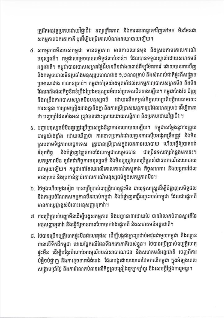 ៥. បញ្ហាមនុស្សធម៌មិនគួរត្រូវប្រើប្រាស់ក្នុងនិន្នាការនយោបាយឡើយ។ កម្ពុជាសម្ដែងនូវការព្រួយ បារម្ភយ៉ាងខ្លាំង ដោយឃើញថា ការចោទប្រកាន់ដោយគ្មានការស៊ើបអង្កេតត្រឹមត្រូវ និងមិន ស្របតាមទិដ្ឋភាពបច្ចេកទេស ត្រូវបានប្រើប្រាស់ក្នុងចេតនានយោបាយ ហើយធ្វើឱ្យបាត់បង់ ទំនុកចិត្ត និងបំផ្លាញ វឌ្ឍនភាពដែលកម្ពុជាសម្រេចបាន ជាច្រើនទសវត្សរ៍កន្លងមកនេះ។ សកម្មភាពមីន គួរតែជាកិច្ចការមនុស្សធម៌ និងមិនគួរត្រូវបានប្រើប្រាស់ជាឧបករណ៍នយោបាយ ណាមួយឡើយ។ កម្ពុជានៅតែឈរលើគោលការណ៍ភស្តុតាង កិច្ចសហការ និងយន្តការដែល មានស្រាប់ និងប្រកាន់ខ្ជាប់គោលការណ៍មនុស្សធម៌ក្នុងសកម្មភាពមីន។