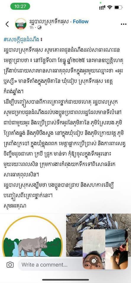 តាមរយៈបណ្តាញសង្គមនៅយប់ ថ្ងៃទី០៣ ខែធ្នូ ឆ្នាំ២០២៥ រដ្ឋបាលស្រុកទឹកផុស បានឲ្យដឹងថា នៅថ្ងៃពុធនេះ គេបានប្រទះឃើញត្រីងាប់ ក្នុងអូរមួយឈ្មោះថា អូរឬស្សី មានទីតាំងក្នុងភូមិតានៃ ឃុំជៀប ស្រុកទឹកផុស ខេត្តកំពង់ឆ្នាំង ។