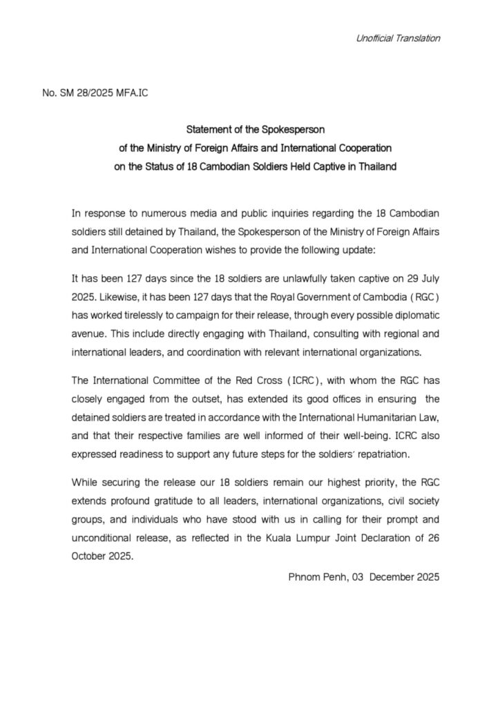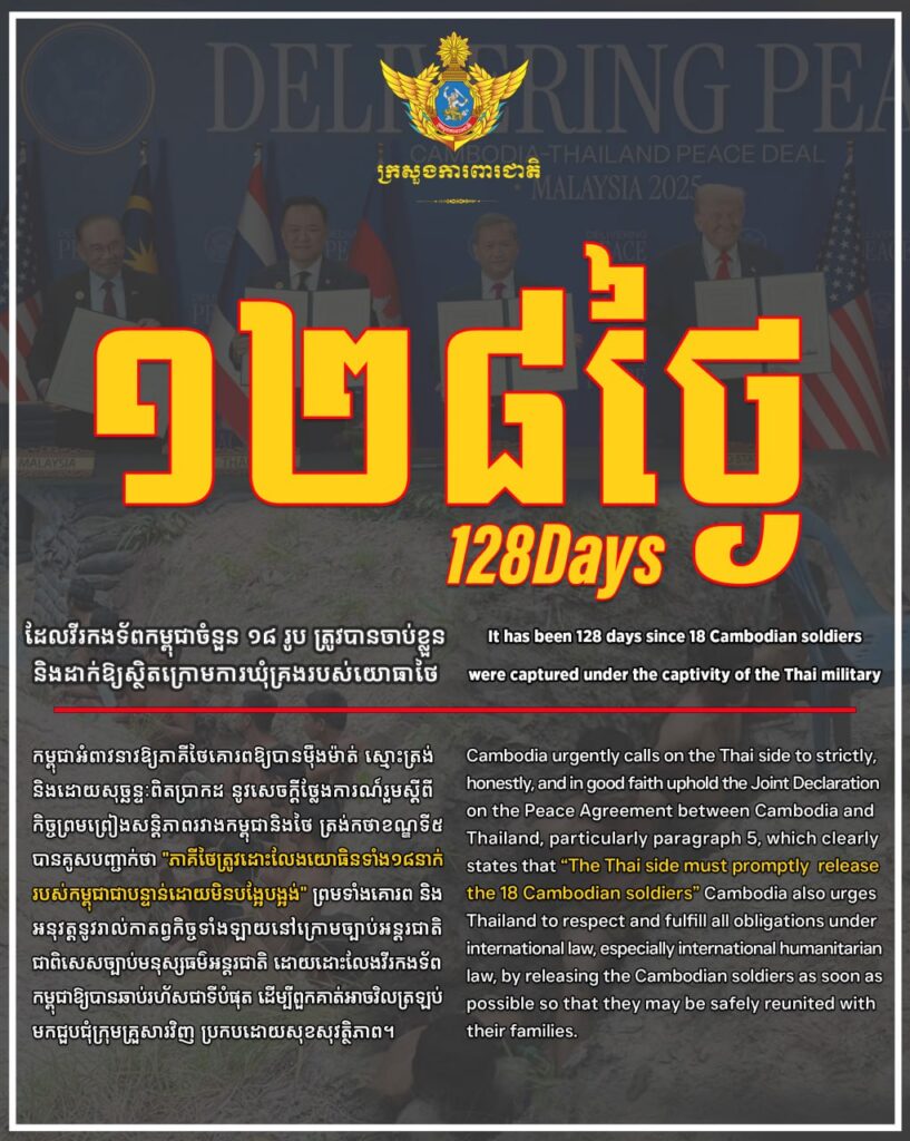 អស់រយៈពេល១២៧ ថ្ងៃហើយ គិតចាប់តាំងពីពេលយោធិនទាំង១៨រូប ត្រូវបានចាប់ខ្លួន ដោយខុសច្បាប់ កាលពីថ្ងៃទី២៩ ខែកក្កដា ឆ្នាំ២០២៥។ ដូចគ្នានេះដែរ គឺអស់រយៈពេល ១២៧ ថ្ងៃហើយ ដែលរាជរដ្ឋាភិបាលកម្ពុជាបានបន្តខិតខំប្រឹងប្រែងឥតស្រាកស្រាន្ត ដើម្បីជំរុញយុទ្ធនាការ ទាមទារការដោះលែងយោធិនរបស់យើងទាំងអស់នេះ តាមគ្រប់មធ្យោបាយការទូតដែលអាចធ្វើទៅ បាន រួមបញ្ចូលទាំងការទាក់ទងផ្ទាល់ជាមួយប្រទេសថៃ ការពិគ្រោះយោបល់ជាមួយមេដឹកនាំក្នុង តំបន់ និងអន្តរជាតិ និងការសម្របសម្រួលជាមួយអង្គការអន្តរជាតិដែលពាក់ព័ន្ធ។