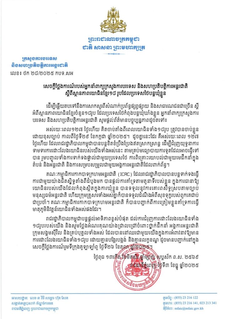 ភ្នំពេញ ៖ ក្រសួងការបរទេស និងសហប្រតិបត្តិការអន្តរជាតិ នៅថ្ងៃទី៣ ខែធ្នូ ឆ្នាំ២០២៥ បានចេញសេចក្ដីថ្លែងការណ៍ ស្តីពីស្ថានភាពយោធិនខ្មែរ១៨ រូបដែលប្រទេសថៃបន្តឃុំខ្លួន។
