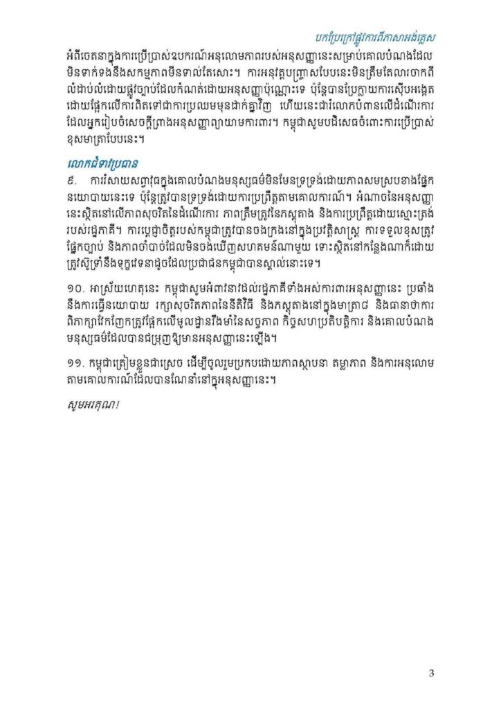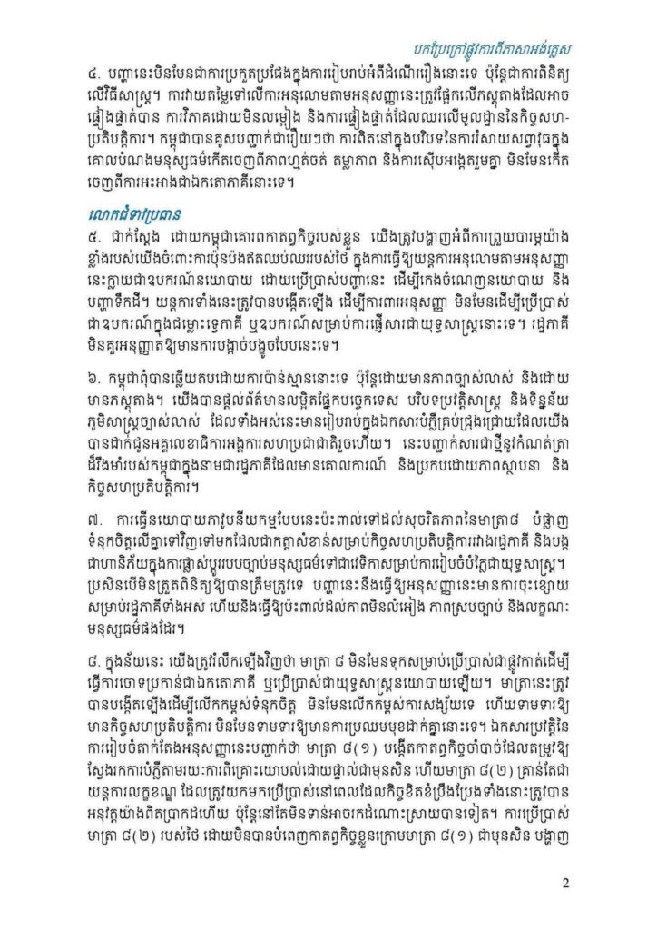 អំពីចេតនាក្នុងការប្រើប្រាស់ឧបករណ៍អនុលោមភាពរបស់អនុសញ្ញានេះសម្រាប់គោលបំណងដែលមិនទាក់ទងនឹងសកម្មភាពមីនទាល់តែសោះ។ ការអនុវត្តបញ្ច្រាសបែបនេះមិនត្រឹមតែលាវចាកពី លំដាប់លំដោយផ្លូវច្បាប់ដែលកំណត់ដោយអនុសញ្ញាប៉ុណ្ណោះទេ ប៉ុន្តែបានប្រែក្លាយការស៊ើបអង្កេត ដោយផ្អែកលើការពិតទៅជាការប្រឈមមុនដាក់គ្នាវិញ ហើយនេះជារំលោភបំពានលើដំណើរការ ដែលអ្នករៀបចំសេចក្តីព្រាងអនុសញ្ញាព្យាយាមការពារ។ កម្ពុជាសូមបដិសេធចំពោះការប្រើប្រាស់ខុសមាត្រាបែបនេះ។