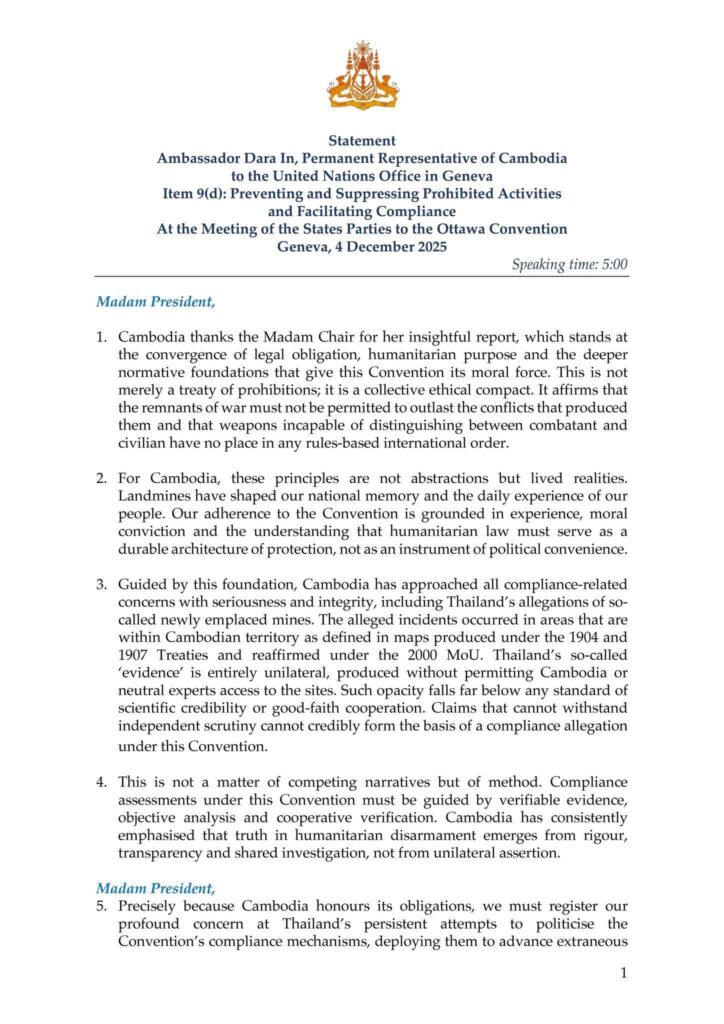 ទីក្រុងហ្សឺណែវ ៖ ឯកឧត្តម ឯកអគ្គរាជទូត អុិន តារា តំណាងអចិន្ត្រៃយ៍នៃកម្ពុជាប្រចាំអង្គការសហប្រជាជាតិនៅទីក្រុងហ្ស៊ឺណែវ អញ្ជើញថ្លែងបទអន្តរាគមន៍ ក្រោមរបៀបវារៈទី៩ ស្តីពី៖ ការទប់ស្កាត់ និងបង្ក្រាបសកម្មភាពហាមឃាត់ និង សម្រួលដល់ការអនុលោមតាម នៅក្នុងកិច្ចប្រជុំរដ្ឋភាគីនៃអនុសញ្ញាអូតាវ៉ា ទីក្រុងហ្សឺណែវ ថ្ងៃទី៤ ខែធ្នូ ឆ្នាំ២០២៥។