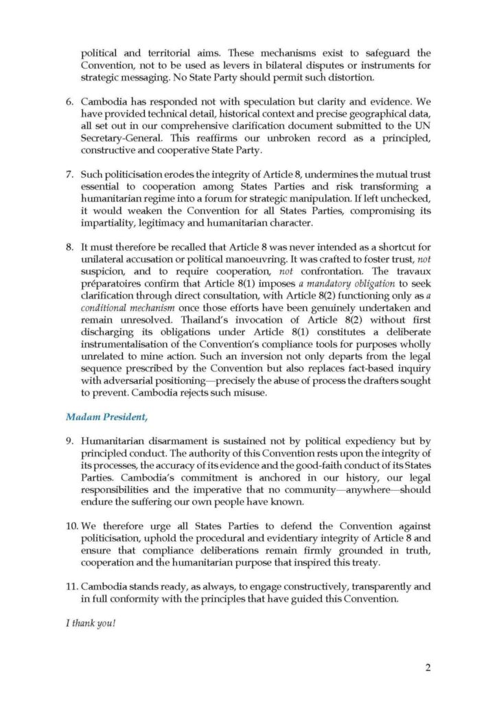 ជាក់ស្ដែង ដោយកម្ពុជាគោរពកាតព្វកិច្ចរបស់ខ្លួន យើងត្រូវបង្ហាញអំពីការព្រួយបារម្ភយ៉ាង ខ្លាំងរបស់យើងចំពោះការប៉ុនប៉ងឥតឈប់ឈររបស់ថៃ ក្នុងការធ្វើឱ្យយន្តការអនុលោមតាមអនុសញ្ញ នេះក្លាយជាឧបករណ៍នយោបាយ ដោយប្រើប្រាស់បញ្ហានេះ ដើម្បីកេងចំណេញនយោបាយ និង បញ្ហាទឹកដី។ យន្តការទាំងនេះត្រូវបានបង្កើតឡើង ដើម្បីការពារអនុសញ្ញា មិនមែនដើម្បីប្រើប្រាស់ ជាឧបករណ៍ក្នុងជម្លោះទ្វេភាគី ឬឧបករណ៍សម្រាប់ការផ្ញើសារជាយុទ្ធសាស្ត្រនោះទេ។ រដ្ឋភាគី មិនគួរអនុញ្ញាតឱ្យមានការបង្កាច់បង្អួចបែបនេះទេ។