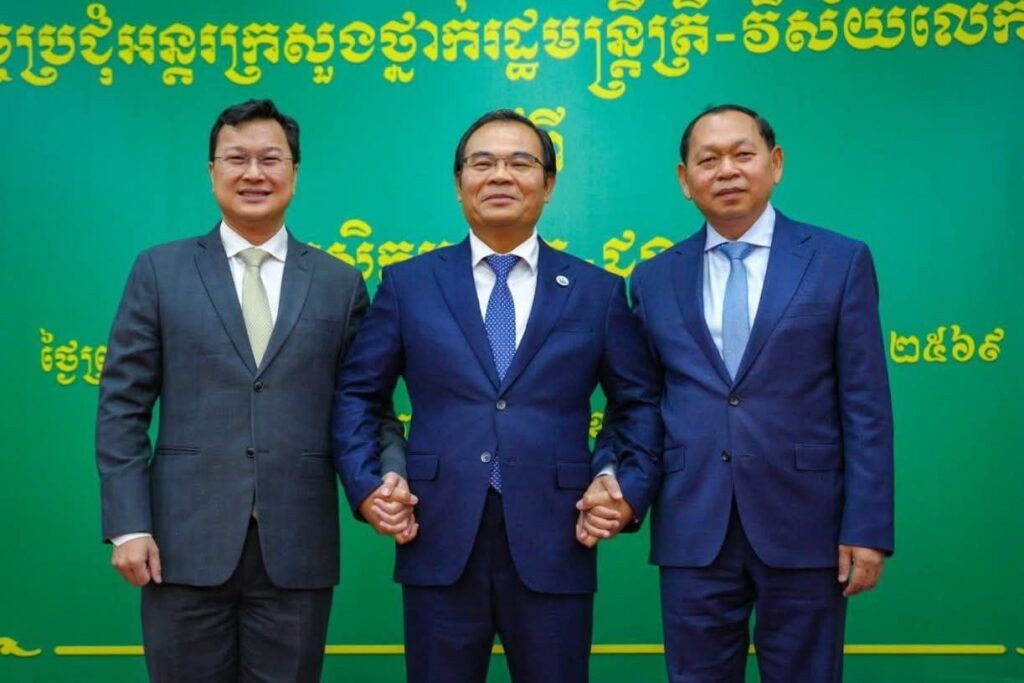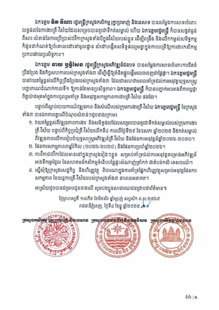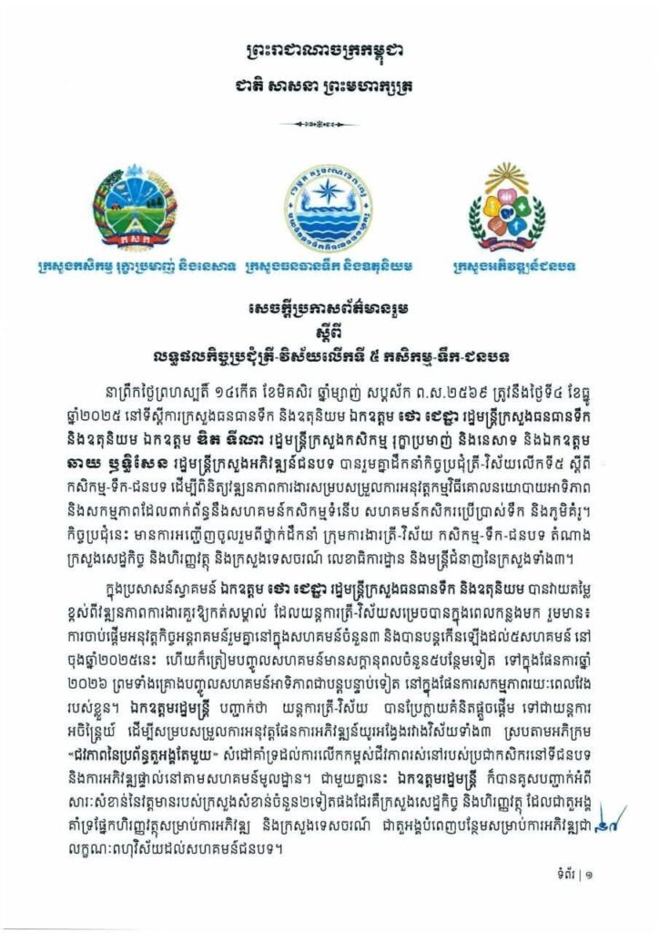 នាព្រឹកថៃ្ងព្រហស្បតិ៍ ១៤កើត ខែមិគសិរ ឆ្នាំម្សាញ់ សប្តស័ក ព.ស.២៥៦៩ ត្រូវនឹងថ្ងៃទី៤ ខែធ្នូ ឆ្នាំ២០២៥ នៅទីស្តីការក្រសួងធនធានទឹក និងឧតុនិយម ឯកឧត្តម ថោ ជេដ្ឋា រដ្ឋមន្ត្រីក្រសួងធនធានទឹក និងឧតុនិយម ឯកឧត្តម ឌិត ទីណា រដ្ឋមន្ត្រីក្រសួងកសិកម្ម រុក្ខាប្រមាញ់ និងនេសាទ និងឯកឧត្តម ឆាយ ឫទ្ធិសែន រដ្ឋមន្ត្រីក្រសួងអភិវឌ្ឍន៍ជនបទ បានរួមគ្នាដឹកនាំកិច្ចប្រជុំត្រី-វិស័យលើកទី៥ ស្ដីពី កសិកម្ម-ទឹក-ជនបទ ដើម្បីពិនិត្យវឌ្ឍនភាពការងារសម្របសម្រួលការអនុវត្តកម្មវិធីគោលនយោបាយអាទិភាព