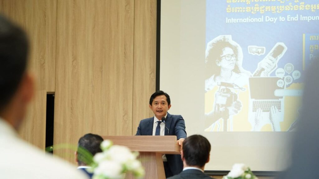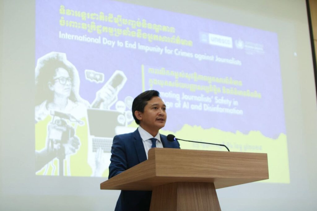 ឯកឧត្តមអ្នកនាំពាក្យក្រសួងព័ត៌មានថ្លែងបែបនេះ ក្នុងឱកាសទិវាអន្តរជាតិបញ្ចប់វប្បធម៌និទណ្ឌភាពចំពោះឧក្រិដ្ឋកម្មប្រឆាំងនឹងអ្នកសារព័ត៌មាន រៀបចំឡើងដោយការិយាល័យឧត្ដមស្នងការអង្គការសហប្រជាជាតិទទួលបន្ទុកសិទ្ធិមនុស្ស (OHCHR) និងអង្គការយូណេស្កូ (UNESCO) នារសៀលថ្ងៃទី ០៤ ខែធ្នូ ឆ្នាំ២០២៥ នៅរាជធានីភ្នំពេញ។ ក្នុងព្រឹត្តិការណ៍ ដែលមានការចូលរួមពីមន្ត្រីជាន់ខ្ពស់ក្រសួងព័ត៌មាន សមាជិកគណៈកម្មាធិការសិទ្ធិមនុស្សកម្ពុជា អ្នកសារព័ត៌មាន និងតំណាងសមាគម អង្គការ សង្គមស៊ីវិល ប្រមាណ៤០នាក់ ឯកឧត្តមអ្នកនាំពាក្យបានគូសបញ្ជាក់ជូនអ្នកចូលរួមទាំងអស់ថា កម្ពុជាប្រឆាំងនិទណ្ឌភាព ហើយបន្តលើកកម្ពស់យុត្តិធម៌ និងសុវត្ថិភាពសម្រាប់ការអនុវត្តសកម្មភាពក្នុងវិជ្ជាជីវៈសារព័ត៌មាន។