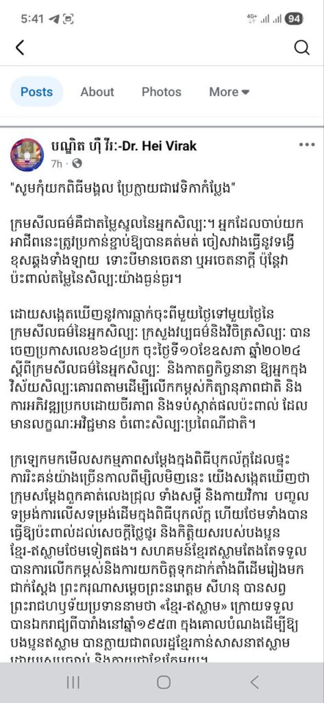 ភ្នំពេញ ៖ ឯកឧត្តម ហ៊ឺ វីរៈ តំណាងរាស្ត្រខេត្តកំពង់ឆ្នាំង បានថ្លែងសារលើបណ្តាញសង្គមហ្វេសប៊ុកនាថ្ងៃទី៦ខែធ្នូនេះថា អ្នកក្នុងវិស័យសិល្បៈទាំងឡាយគួរគប្បីសិក្សាស្វែងយល់ឱ្យបានច្បាស់លាស់ ការលេងសម្តែងទម្រង់ការផ្សេងៗត្រូវគោរព និងអនុលោមតាមក្បួនខ្នាតបុរាណដែលបានកំណត់ទុកជាជាងបំបែកយកទៅលេងសើចខុសទម្រង់ដើម។