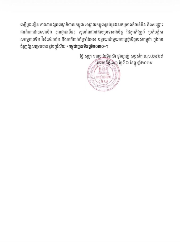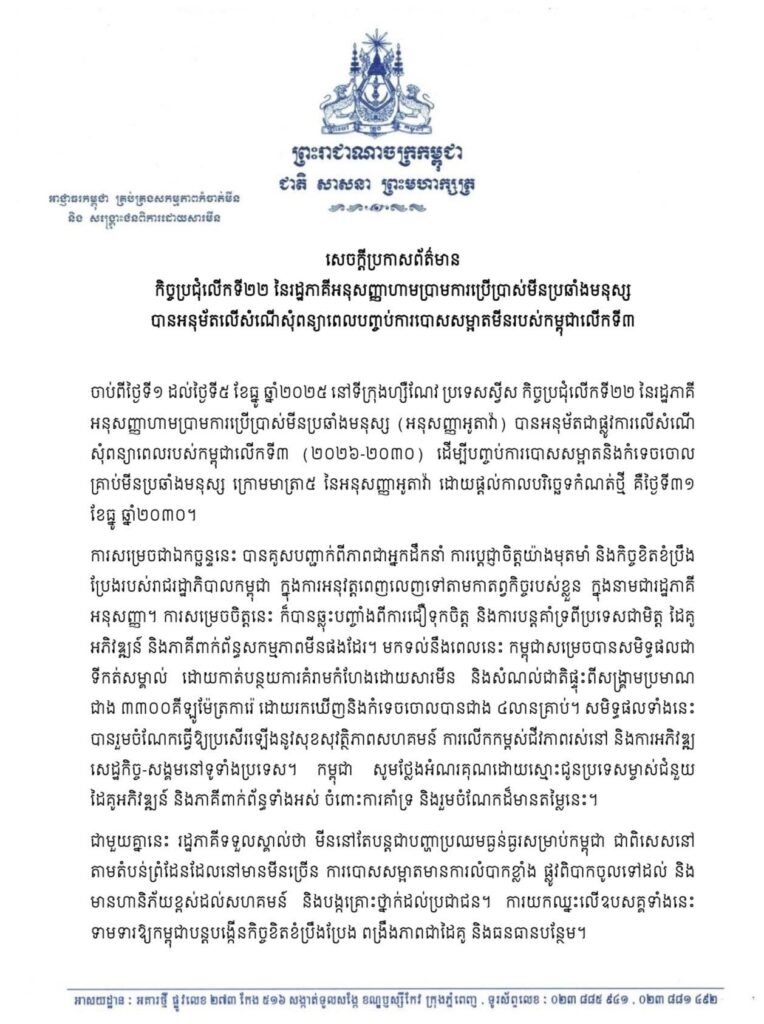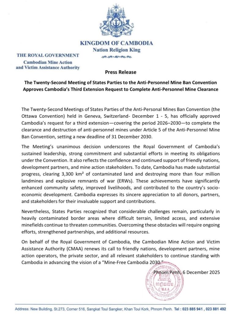 ភ្នំពេញ ៖ កិច្ចប្រជុំលើកទី២២ នៃរដ្ឋភាគីអនុសញ្ញាហាមប្រាមការប្រើប្រាស់មីនប្រឆាំងមនុស្ស (អនុសញ្ញាអូតាវ៉ា) បានអនុម័តជាផ្លូវការ លើសំណើសុំពន្យាពេលរបស់កម្ពុជាលើកទី៣ (២០២៦-២០៣០) ដើម្បីបញ្ចប់ការបោសសម្អាតនិងកំទេចចោលគ្រាប់មីន ប្រឆាំងមនុស្ស ក្រោមមាត្រា៥ នៃអនុសញ្ញាអូតាវ៉ា ដោយផ្តល់កាលបរិច្ឆេទកំណត់ថ្មី គឺថ្ងៃទី៣១ ខែធ្នូ ឆ្នាំ២០៣០៕ រក្សាសិទ្ធដោយ៖សុទ្ធលី