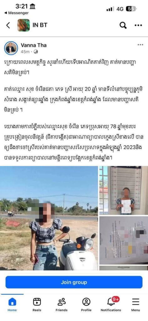 កំពង់ឆ្នាំងៈ យោងតាមការបំភ្លឺរបស់ឈ្មោះ សុខ ចំរើន ភេទប្រុសអាយុ ៧៨ឆ្នាំមុខរបរគ្រូបង្រៀនចូលនិវត្តន៍ (ជីតាបង្កើត)ជាអាណាព្យាបាលក្មេងស្រីខាងលើ បានឲ្យដឹងថា ចៅស្រីរបស់គាត់មានបញ្ហាសរសៃប្រសាទក្នុងអំឡុងឆ្នាំ២០២៣ និងបានទទួលការព្យាបាលនៅមន្ទីរពេទ្យបង្អែកខេត្តកំពង់ឆ្នាំង។