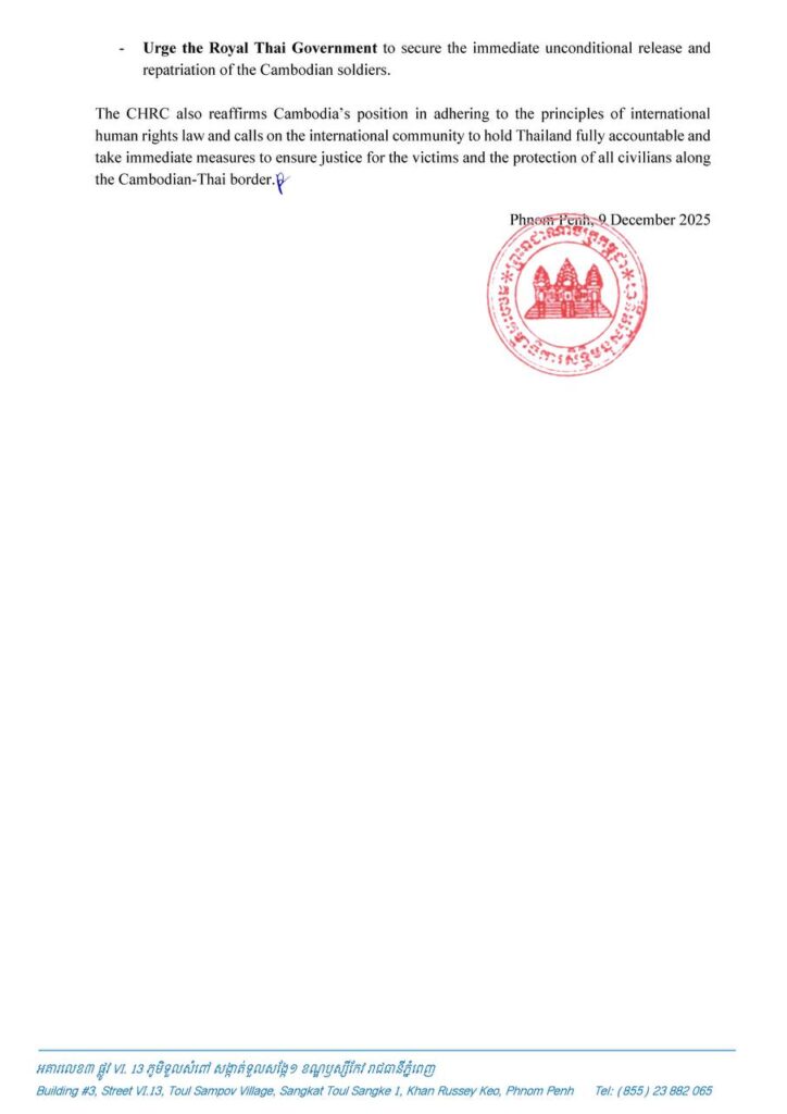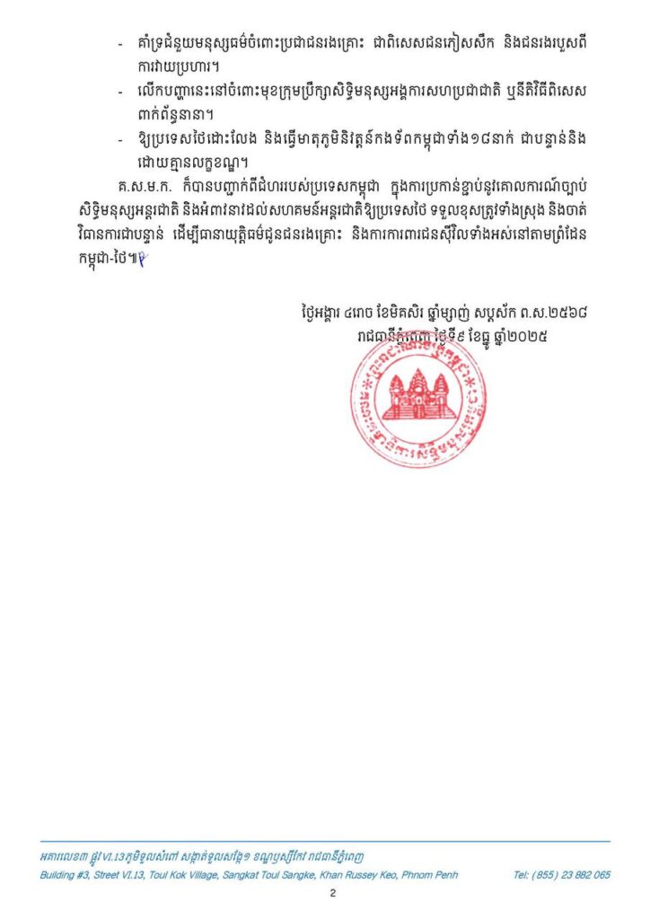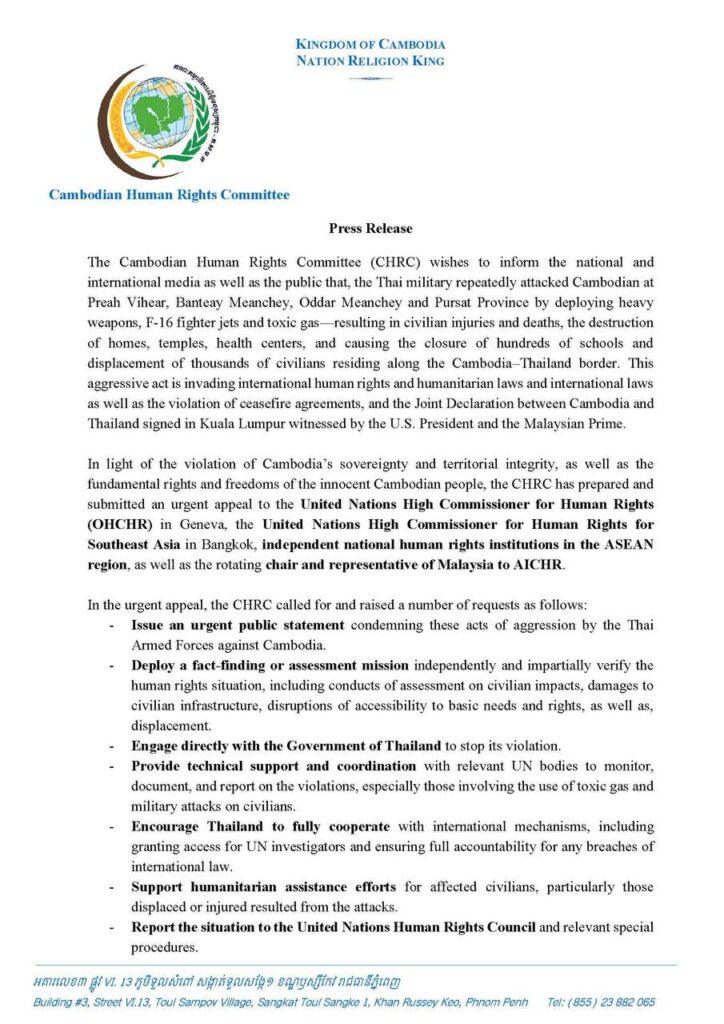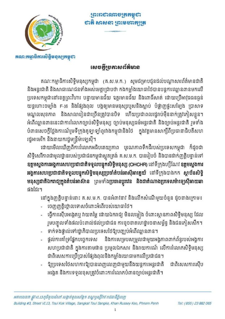 ភ្នំពេញ ៖ គណៈកម្មាធិការសិទ្ធិមនុស្សកម្ពុជា (គ.ស.ម.ក.) សូមជម្រាបជូនដល់បណ្តាសារព័ត៌មានជាតិ និងអន្តរជាតិ និងសាធារណជនទាំងអស់មេត្តាជ្រាបថា កងកម្លាំងយោធាថៃបានបន្តការឈ្លានពានមកលើ ប្រទេសកម្ពុជានៅខេត្តព្រះវិហារ បន្ទាយមានជ័យ ឧត្តរមានជ័យ និងពោធិ៍សាត់ ដោយប្រើអាវុធធនធ្ងន់ យន្តហោះចម្បាំង F-16 និងផ្សែងពុល បង្កឲ្យមានមនុស្សរបួសនិងស្លាប់ បំផ្លាញផ្ទះសម្បែង ប្រាសាទ មណ្ឌលសុខភាព និងសាលារៀនជាច្រើនត្រូវបានបិទ ហើយប្រជាពលរដ្ឋរាប់ម៉ឺននាក់ត្រូវភៀសខ្លួន។ អំពើឈ្លានពាននេះជាការរំលោភច្បាប់សិទ្ធិមនុស្ស ច្បាប់មនុស្សធម៌អន្តរជាតិ និងច្បាប់អន្តរជាតិ រួមទាំង បំពានសេចក្តីថ្លែងការណ៍រួមទីក្រុងគូឡាឡាំពួរវាងកម្ពុជានិង ក្នុងវត្តមានសាក្សីពីប្រធានាធិបតីសហ រដ្ឋអាមេរិក និងនាយករដ្ឋមន្ត្រីម៉ាឡេស៊ី។