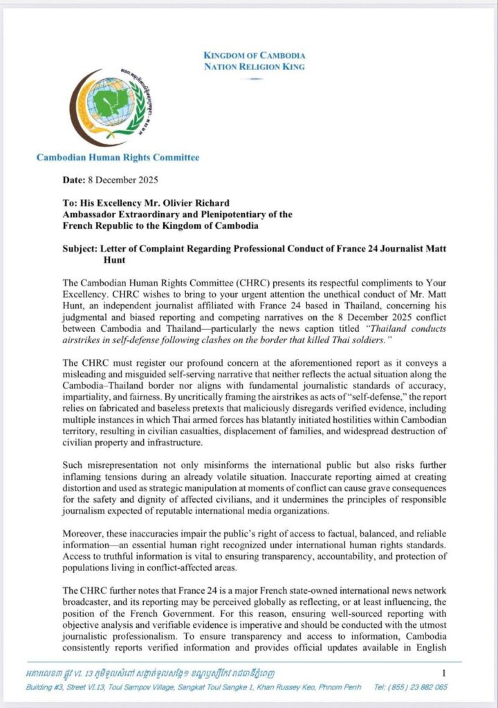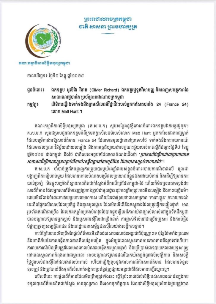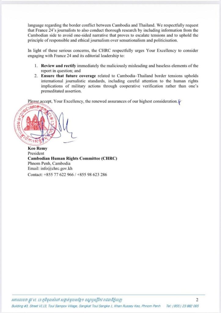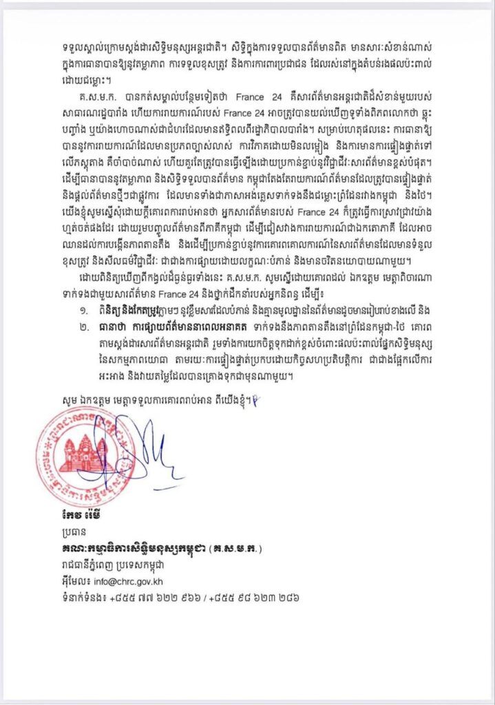គ.ស.ម.ក. សូមស្នើដោយគោរពដល់ឯកអគ្គរដ្ឋទូតវិសាមញ្ញនិងពេញសមត្ថភាពនៃសាធារណរដ្ឋបារាំង ប្រចាំព្រះរាជាណាចក្រកម្ពុជា មេត្តាពិចារណាទាក់ទងជាមួយសារព័ត៌មាន France 24 និងថ្នាក់ដឹកនាំរបស់អ្នកនិពន្ធ ដើម្បី៖