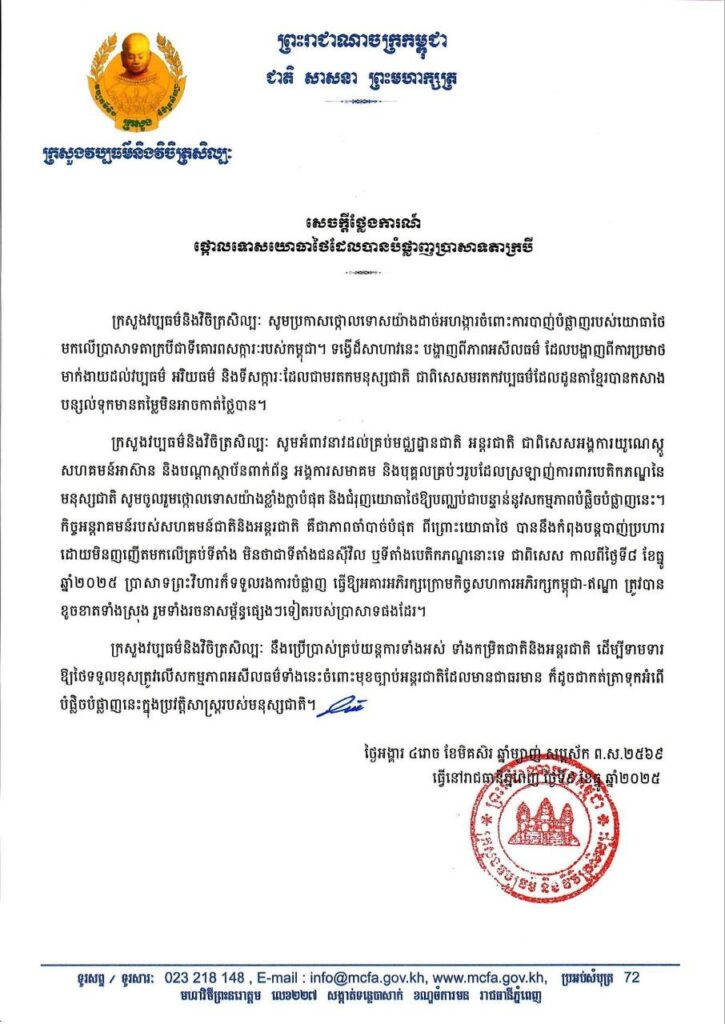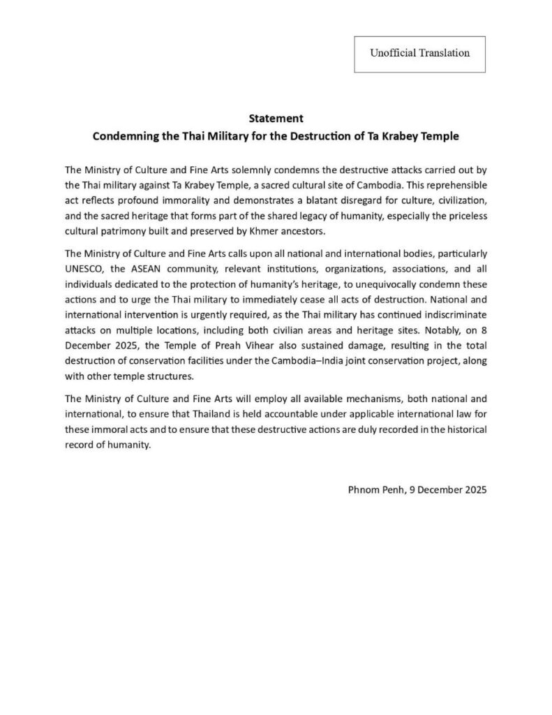 ក្រសួងវប្បធម៌និងវិចិត្រសិល្បៈ សូមអំពាវនាវដល់គ្រប់មជ្ឈដ្ឋានជាតិ អន្តរជាតិ ជាពិសេសអង្គការយូណេស្កូ សហគមន៍អាស៊ាន និងបណ្តាស្ថាប័នពាក់ព័ន្ធ អង្គការសមាគម និងបុគ្គលគ្រប់ៗរូបដែលស្រឡាញ់ការពារបេតិកភណ្ឌន មនុស្សជាតិ សូមចូលរួមថ្កោលទោសយ៉ាងខ្លាំងក្លាបំផុត និងជំរុញយោធាថៃឱ្យបញ្ឈប់ជាបន្ទាន់នូវសកម្មភាពបំផ្លិចបំផ្លាញនេះ។ កិច្ចអន្តរាគមន៍របស់សហគមន៍ជាតិនិងអន្តរជាតិ គឺជាភាពចាំបាច់បំផុត ពីព្រោះយោធាថៃ បាននឹងកំពុងបន្តបាញ់ប្រហារ ដោយមិនញញើតមកលើគ្រប់ទីតាំង មិនថាជាទីតាំងជនស៊ីវិល ឬទីតាំងបេតិកភណ្ឌនោះទេ ជាពិសេស កាលពីថ្ងៃទី៨ ខែធ្នូ ឆ្នាំ២០២៥ ប្រាសាទព្រះវិហារក៏ទទួលរងការបំផ្លាញ ធ្វើឱ្យអគារអភិរក្សក្រោមកិច្ចសហការអភិរក្សកម្ពុជា-ឥណ្ឌា ត្រូវបាន ខូចខាតទាំងស្រុង រួមទាំងរចនាសម្ព័ន្ធផ្សេងៗទៀតរបស់ប្រាសាទផងដែរ។