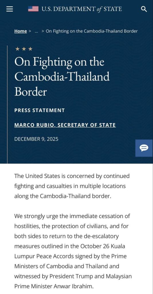 ភ្នំពេញ ៖ ក្រសួងការបរទេសអាមេរិក ចេញសេចក្តីប្រកាសជាផ្លូវការថា សហរដ្ឋអាមេរិក មានក្តីកង្វល់លើបញ្ហាជម្លោះ កម្ពុជា-ថៃ ដោយបានអំពាវនាវប្រទេសទាំងពីរបញ្ឈប់ទំនាស់ជាបន្ទាន់ ដើម្បីការការពារជនស៊ីវិល និងវិលត្រឡប់ទៅរកវិធានការកាត់បន្ថយភាពតានតឹង ដូចដែលបានគូសបញ្ជាក់នៅក្នុងកិច្ចព្រមព្រៀងសន្តិភាព នាថ្ងៃទី២៦ ខែតុលា ឆ្នាំ២០២៥ ដែលមានលោកប្រធានាធិបតី ដូណាល់ ត្រាំ និង នាយករដ្ឋមន្ត្រី ម៉ាឡេស៊ីលោក Anwar Ibrahim ជាសាក្សី៕ រក្សាសិទ្ធដោយ៖សុទ្ធលី