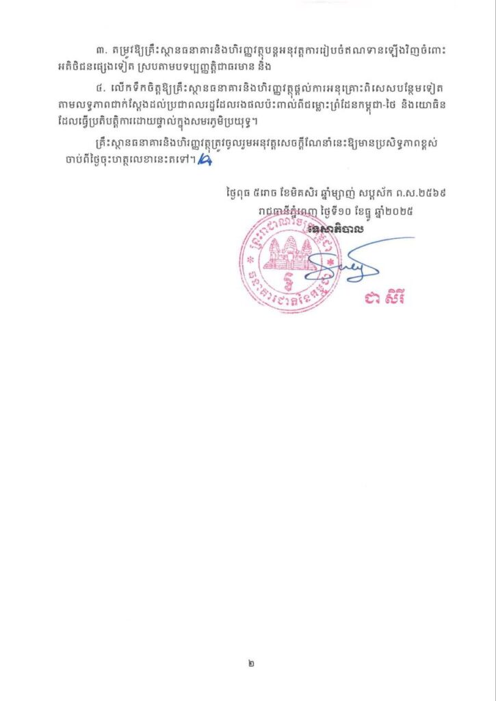 ឆ្លើយតបនឹងការអំពាវនាវរបស់ សម្តេចមហាបវរធិបតី ហ៊ុន ម៉ាណែត នាយករដ្ឋមន្តី នៃព្រះរាជាណាចក្រកម្ពុជា និងក្នុងស្មារតីសាមគ្គីភាព មនុស្សធម៌ និងស្របតាមគោលនយោបាយ របស់រាជរដ្ឋាភិបាលក្នុងការជួយសម្រាលបន្ទុកដល់យោធិនដែលធ្វើប្រតិបត្តិការដោយផ្ទាល់ក្នុងសមរភូមិ ប្រយុទ្ធ ប្រជាពលរដ្ឋដែលរងផលប៉ះពាល់ពីជម្លោះព្រំដែនកម្ពុជា-ថៃ ធនាគារជាតិនៃកម្ពុជាសម្រេចដាក់ ចេញនូវសេចក្ដីណែនាំ ដូចខាងក្រោម៖