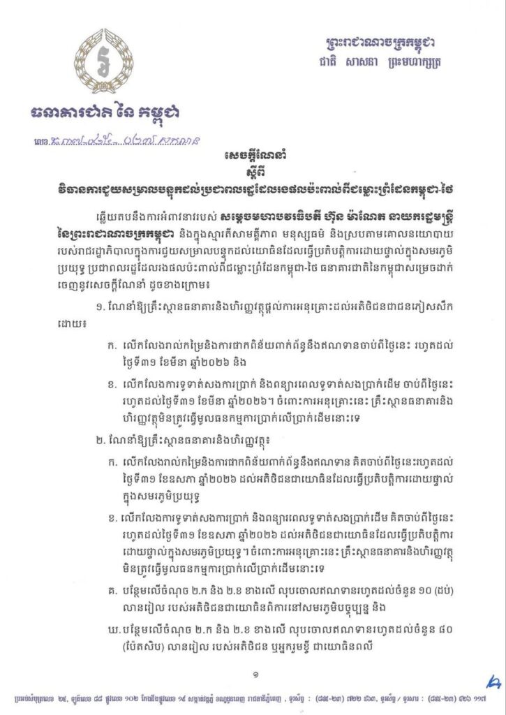 ខ. លើកលែងការទូទាត់សងការប្រាក់ និងពន្យារពេលទូទាត់សងប្រាក់ដើម គិតចាប់ពីថ្ងៃនេះ រហូតដល់ថ្ងៃទី៣១ ខែឧសភា ឆ្នាំ២០២៦ ដល់អតិថិជនជាយោធិនដែលធ្វើប្រតិបត្តិការ ដោយផ្ទាល់ក្នុងសមរភូមិប្រយុទ្ធ។ចំពោះការអនុគ្រោះនេះ គ្រឹះស្ថានធនាគារនិងហិរញ្ញវត្ថុ មិនត្រូវធ្វើមូលធនកម្មការប្រាក់លើប្រាក់ដើមនោះទេ