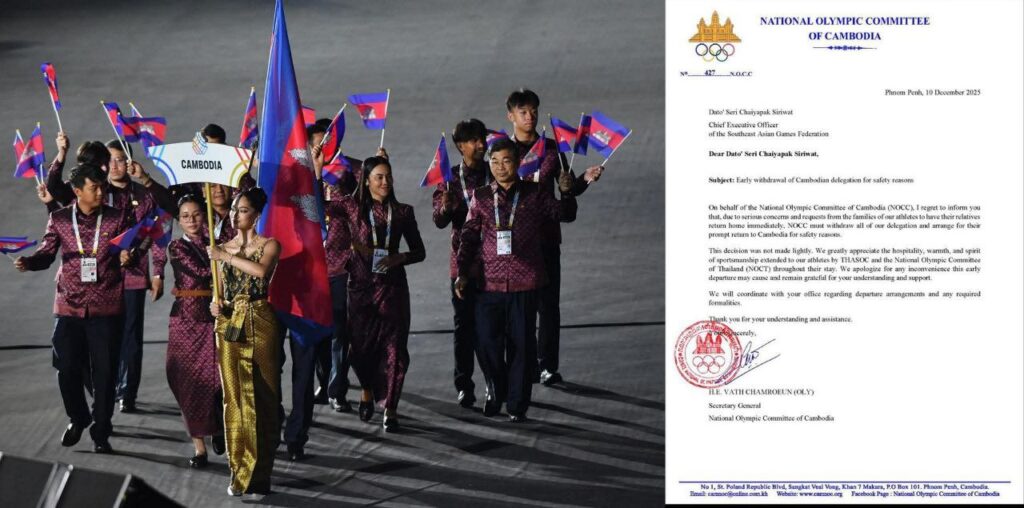 ភ្នំពេញ ៖ យោងតាមលិខិតរបស់គណៈកម្មាធិការជាតិអូឡាំពិកកម្ពុជា បានបញ្ជាក់ថាកម្ពុជា បានដកខ្លួនពីការប្រកួតកីឡស៊ីហ្គេម ២០២៥ហើយ ដោយសារបារម្ភពីសុវត្ថិភាព។