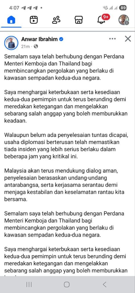 គូឡាឡាំពួ ៖ លោក អាន់វ៉ា អ៉ីប្រាហ៊ីម នាយករដ្ឋមន្ត្រីម៉ាឡេស៊ី បានបើកកិច្ចសន្ទនាតាមទូរស័ព្ទជាមួយនាយករដ្ឋមន្ត្រីកម្ពុជា និងថៃ ដើម្បីពិភាក្សាពីជម្លោះដែលកំពុងកើតឡើងនៅតំបន់ព្រំដែនរវាងប្រទេសទាំង២។