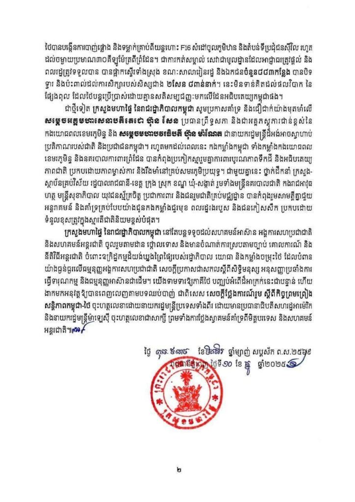 ជាថ្មីទៀត ក្រសួងមហាផ្ទៃ នៃរាជរដ្ឋាភិបាលកម្ពុជា សូមប្រកាសគាំទ្រ និងជឿជាក់យ៉ាងមុតមាំលើ សម្តេចអគ្គមហាសេនាបតីតេជោ ហ៊ុន សែន ប្រធានព្រឹទ្ធសភា និងជាអគ្គភស្ដុភារជាន់ខ្ពស់ន កងយោធពលខេមរភូមិន្ទ និង សម្តេចមហាបវរធិបតី ហ៊ុន ម៉ាណែត ជានាយករដ្ឋមន្ត្រីដ៏អង់អាចស្វាហាប់ ប្រតិភាណរបស់ជាតិ និងប្រជាជនកម្ពុជា។ រហូតមកដល់ពេលនេះ កងកម្លាំងកម្ពុជា ទាំងកម្លាំងកងយោធពល ខេមរភូមិន្ទ និងនគរបាលការពារព្រំដែន បានកំពុងប្រកៀកស្មារួមគ្នាការពារបូរណភាពទឹកដី និងអធិបតេយ្យ ភាពជាតិ ប្រកបដោយភាពម្ចាស់ការ និងរឹងមាំនៅគ្រប់សមរភូមិប្រយុទ្ធ។ ជាមួយគ្នានេះ ថ្នាក់ដឹកនាំ ក្រសួង- ស្ថាប័នគ្រប់វិស័យ រដ្ឋបាលរាជធានី-ខេត្ត ក្រុង ស្រុក ខណ្ឌ ឃុំ-សង្កាត់ រួមទាំងមន្ត្រីនគរបាលជាតិ កងរាជអាវុធ ហត្ថ មន្ត្រីសុខាភិបាល យុវជនស្ម័គ្រចិត្ត ប្រជាការពារ និងជនរួមជាតិគ្រប់មជ្ឈដ្ឋាន បានកំពុងរួមសាមគ្គីគា្នជួយ អន្តរាគមន៍ និងគាំទ្រគ្រប់បែបយ៉ាងជូនកងកម្លាំងជួរមុខ ពលរដ្ឋរងរបួស និងជនភៀសសឹក ប្រកបដោយ ទំនួលខុសត្រូវក្នុងស្មារតីជាតិនិយមខ្ពស់បំផុត។