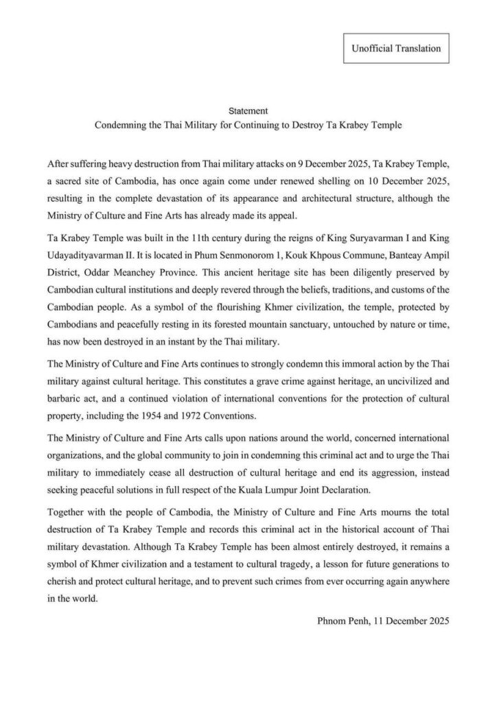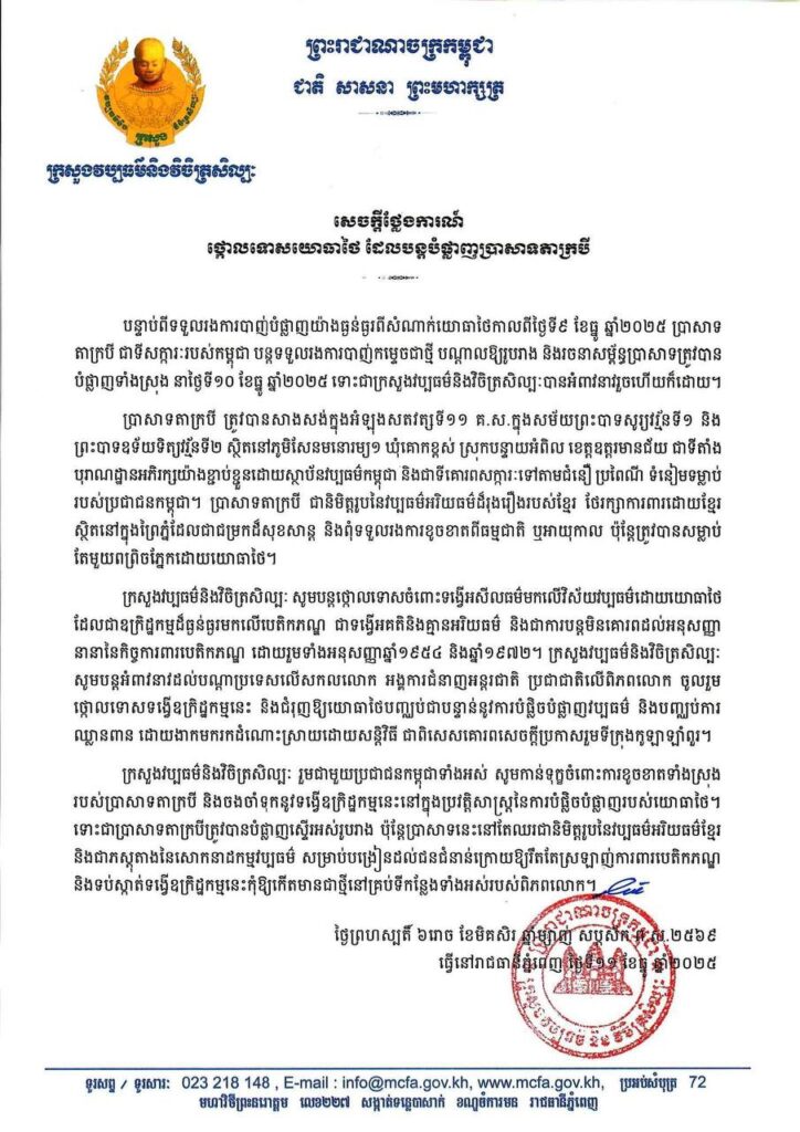 ក្រសួងវប្បធម៌និងវិចិត្រសិល្បៈ សូមបន្តថ្កោលទោសចំពោះទង្វើអសីលធម៌មកលើវិស័យវប្បធម៌ដោយយោធាថ ដែលជាឧក្រិដ្ឋកម្មដ៏ធ្ងន់ធ្ងរមកលើបេតិកភណ្ឌ ជាទង្វើអគតិនិងគ្មានអរិយធម៌ និងជាការបន្តមិនគោរពដល់អនុសញ្ញ នានានៃកិច្ចការពារបេតិកភណ្ឌ ដោយរួមទាំងអនុសញ្ញាឆ្នាំ១៩៥៤ និងឆ្នាំ១៩៧២។ ក្រសួងវប្បធម៌និងវិចិត្រសិល្បៈ សូមបន្តអំពាវនាវដល់បណ្តាប្រទេសលើសកលលោក អង្គការជំនាញអន្តរជាតិ ប្រជាជាតិលើពិភពលោក ចូលរួម ថ្កោលទោសទង្វើឧក្រិដ្ឋកម្មនេះ និងជំរុញឱ្យយោធាថៃបញ្ឈប់ជាបន្ទាន់នូវការបំផ្លិចបំផ្លាញវប្បធម៌ និងបញ្ឈប់ការ ឈ្លានពាន ដោយងាកមករកដំណោះស្រាយដោយសន្តិវិធី ជាពិសេសគោរពសេចក្តីប្រកាសរួមទីក្រុងកូឡាឡាំពួរ។