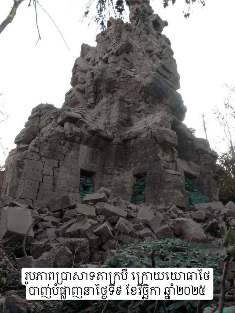 ភ្នំពេញ ៖ បន្ទាប់ពីទទួលរងការបាញ់បំផ្លាញយ៉ាងធ្ងន់ធ្ងរពីសំណាក់យោធាថៃកាលពីថ្ងៃទី៨-៩ ខែធ្នូ ឆ្នាំ២០២៥ ប្រាសាទតាក្របី ជាទីសក្ការៈរបស់កម្ពុជា បន្តទទួលរងការបាញ់កម្ទេចជាថ្មី បណ្តាលឱ្យរូបរាង និងរចនាសម្ព័ន្ធប្រាសាទត្រូវបានបំផ្លាញទាំងស្រុង នាថ្ងៃទី១០ ខែធ្នូ ឆ្នាំ២០២៥ ទោះជាក្រសួងវប្បធម៌និងវិចិត្រសិល្បៈបានអំពាវនាវរួចហើយក៏ដោយ។
