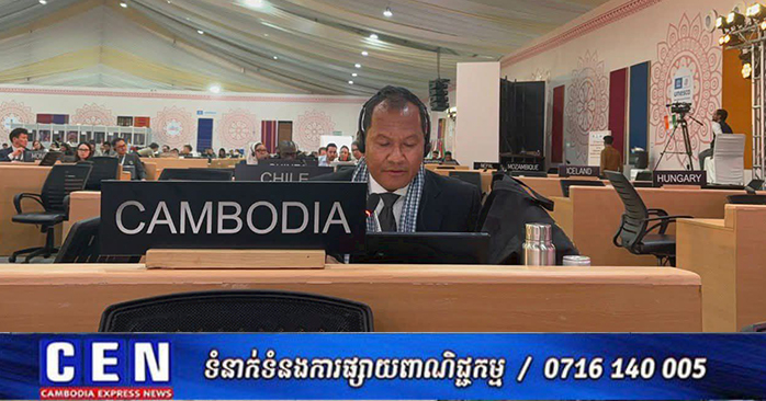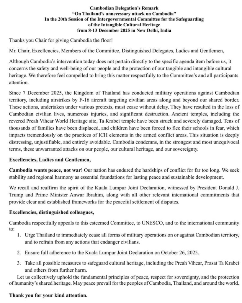 កាលពីថ្ងៃទី ១២ ខែធ្នូ ឆ្នាំ២០២៥ ឯកឧត្តម ស៊ីយ៉ុន សុភារិទ្ធ អនុរដ្ឋលេខាធិការ នៃក្រសួងវប្បធម៌និងវិចិត្រសិល្បៈ ដែលជាប្រធានគណៈប្រតិភូកម្ពុជាបានធ្វើសេចក្តីថ្លែងការណ៍អំពីការឈ្លានពានរបស់ថៃមកលើបូរណភាពទឹកដីកម្ពុជា ក្នុងសម័យប្រជុំលើកទី២០ នៃគណៈកម្មាការអន្តររដ្ឋាភិបាលដើម្បីការពារបេតិកភណ្ឌវប្បធម៌អរូបី របស់អង្គការយូណេស្កូ ដែលប្រព្រឹត្តទៅចាប់ពីថ្ងៃទី៨ ដល់ ១៣ ខែធ្នូ ឆ្នាំ២០២៥នៅបន្ទាយក្រហម (Red Fort) ទីក្រុងញ៉ូដេលី សាធារណរដ្ឋឥណ្ឌា។ នៅក្នុងកិច្ចប្រជុំនេះមានការចូលរួមពីរដ្ឋភាគីចំនួន ១៥0 ប្រទេស និងអ្នកចូលរួមចំនួន១២៩០រូប៕ រក្សាសិទ្ធដោយ៖សុទ្ធលី