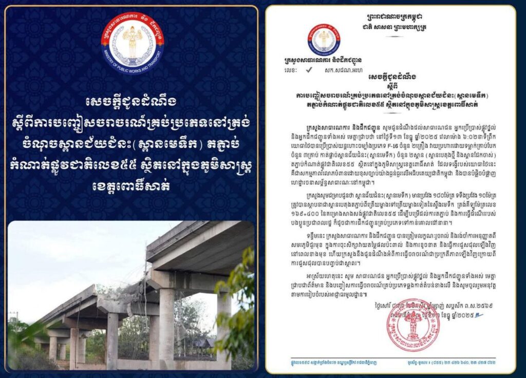 ក្រសួងសាធារណការ និងដឹកជញ្ជូន សូមជូនដំណឹងដល់សាធារណជន អ្នកប្រើប្រាស់ផ្លូវថ្នល់ និងអ្នកដឹកជញ្ជូនទាំងអស់ មេត្ត មេត្តាជ្រាបថា នៅថ្ងៃទី១៣ ខែធ្នូ ឆ្នាំ២០២៥ វេលាម៉ោង ៦:០២នាទីព្រឹក យោធាថៃបានប្រើប្រាស់យន្តហោះចម្បាំងប្រភេទ F-16 ចំនួន ២គ្រឿង វាយប្រហារដោយទម្លាក់គ្រាប់បែក ចំនួន ៣គ្រាប់ កាត់ផ្តាច់ស្ពានជ័យជំនះ (ស្ពានមេទឹក) ចំនួន ២ស្ពាន (ស្ពានបេតុងថ្មី និងស្ពានដែកចាស់) តភ្ជាប់កំណាត់ផ្លូវជាតិលេខ៥៥ ស្ថិតនៅក្នុងភូមិសាស្ត្រខេត្តពោធិ៍សាត់ ដែលទង្វើរបស់យោធាថៃនេះ គឺជាសកម្មភាពរំលោភបំពានដោយខុសច្បាប់យ៉ាងធ្ងន់ធ្ងរលើអធិបតេយ្យជាតិកម្ពុជា និងបានបំផ្លិចបំផ្លាញ ហេដ្ឋារចនាសម្ព័ន្ធសាធារណៈនៅកម្ពុជា។