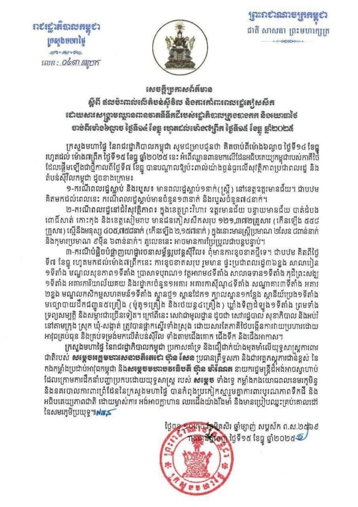 ភ្នំពេញ ៖ ក្រសួងមហាផ្ទៃ ចេញសេចក្ដីប្រកាសព័ត៌មាន ស្ដីពីផលប៉ះពាល់លើតំបន់ស៊ីវិល និងការគាំពារពលរដ្ឋភៀសសឹក ដោយសារសង្គ្រាមឈ្លានពានវាតទីទឹកដីរបស់រដ្ឋាភិបាលក្រុងបាងកក និងយោធាថៃ ចាប់ពីម៉ោង៦ល្ងាច ថ្ងៃទី១៤ ខែធ្នូ រហូតដល់ម៉ោង៧ព្រឹក ថ្ងៃទី១៥ ខែធ្នូ ឆ្នាំ២០២៥