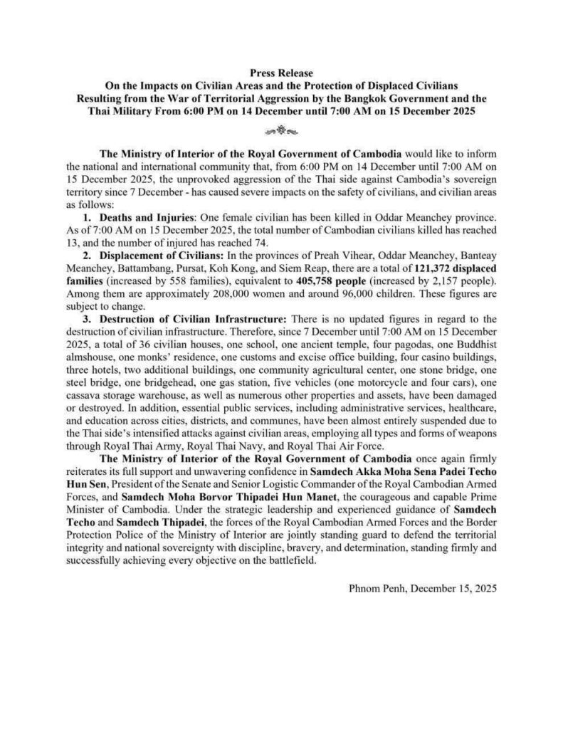 ក្រសួងមហាផ្ទៃ នៃរាជរដ្ឋាភិបាលកម្ពុជា សូមជម្រាបជូនថា គិតចាប់ពីម៉ោង៦ល្ងាច ថ្ងៃទី១៤ ខែធ្នូ រហូតដល់ ម៉ោង៧ព្រឹក ថ្ងៃទី១៥ ខែធ្នូ ឆ្នាំ២០២៥ នេះ អំពើឈ្លានពានមកលើដែនអធិបតេយ្យកម្ពុជារបស់ភាគីចំ ដែលផ្តើមឡើងជាថ្មីកាលពីថ្ងៃទី៧ ខែធ្នូ បានបណ្តាលឱ្យប៉ះពាល់យ៉ាងធ្ងន់ធ្ងរលើសុវត្ថិភាពប្រជាពលរដ្ឋ និង តំបន់ស៊ីវិលកម្ពុជា ដូចខាងក្រោម៖