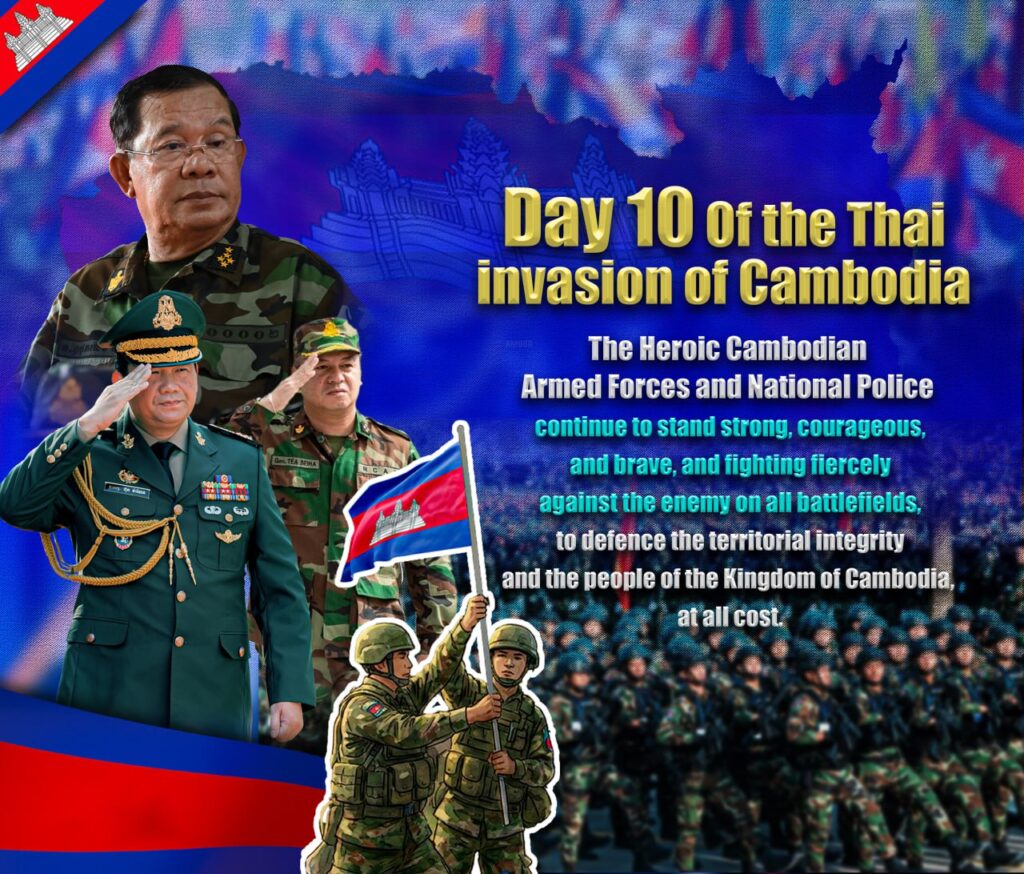 សូមគូសបញ្ជាក់ផងដែរថា គិតរហូតមកដល់ម៉ោងនេះ វីរកងទ័ព និងវីរនគរបាលកម្ពុជាបាននឹងកំពុង បន្តឈរជើងយ៉ាងរឹងមាំ ស្វាហាប់ មោះមុត និងនៅតែតស៊ូប្រយុទ្ធយ៉ាងស្វិតស្វាញតតាំងជាមួយសត្រូវ ឈ្លានពាននៅគ្រប់សមរភូមិទាំងអស់ ក្នុងការបំពេញតួនាទីរបស់ខ្លួន ដើម្បីការពារបូរណភាពទឹកដីរបស់ កម្ពុជា។