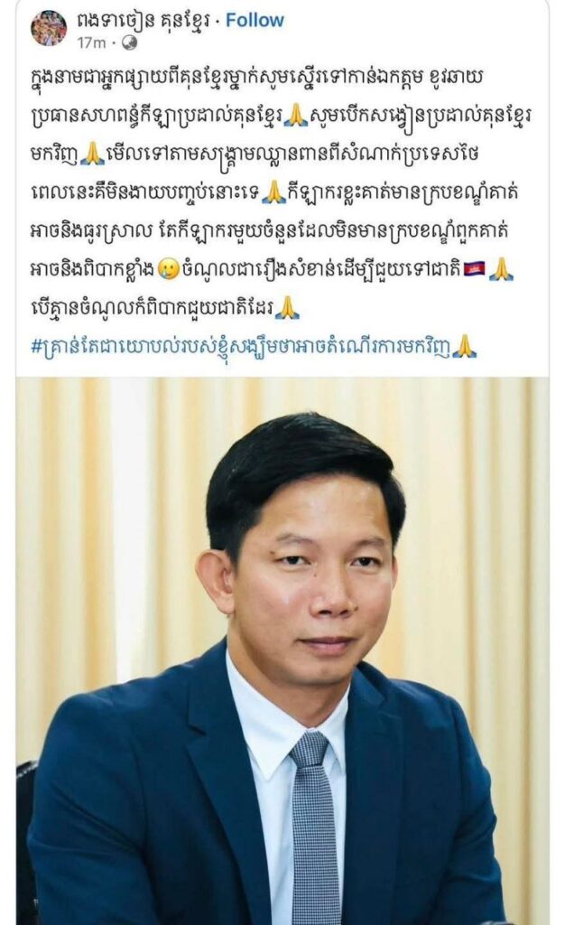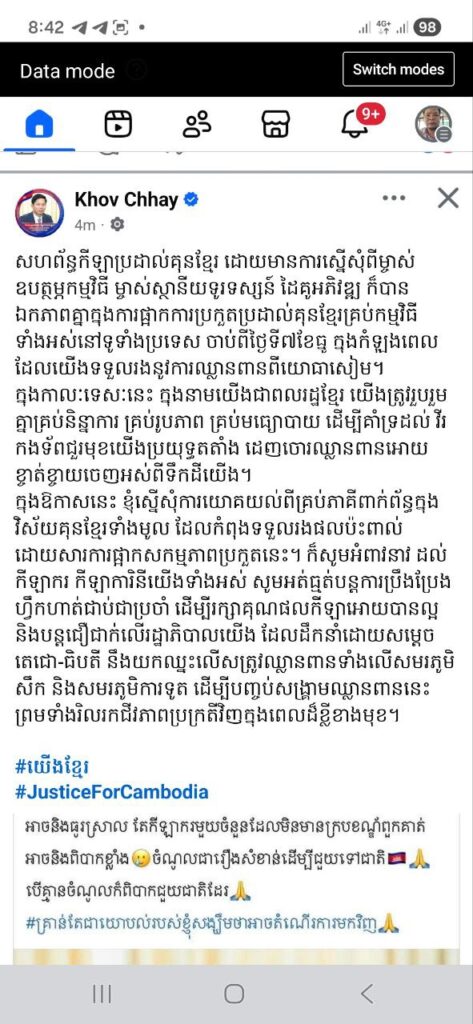 តាមរយៈបណ្តាញសង្គមនាថ្ងៃទី១៦ខែធ្នូឆ្នាំ២០២៥នេះ ប្រធានសហព័ន្ធកីឡាប្រដាល់គុនខ្មែរ បានថ្លែងបន្តទៀតថា ក្នុងកាលៈទេសៈនេះ ក្នុងនាមយើងជាពលរដ្ឋខ្មែរ យើងត្រូវរួបរួមគ្នាគ្រប់និន្នាការ គ្រប់រូបភាព គ្រប់មធ្យោបាយ ដើម្បីគាំទ្រដល់ វីរកងទ័ពជួរមុខយើងប្រយុទ្ធតតាំង ដេញចោរឈ្លានពានអោយខ្ចាត់ខ្ចាយចេញអស់ពីទឹកដីយើង។