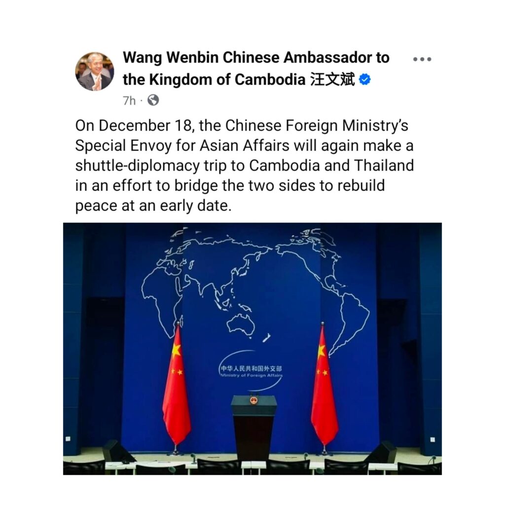 លោក Wang Wenbin ឯកអគ្គរដ្ឋទូតចិនប្រចាំនៅប្រទេសកម្ពុជា បានថ្លែងថា នៅថ្ងៃទី១៨ ខែធ្នូ បេសកជនពិសេសរបស់ក្រសួងការបរទេសចិនទទួលបន្ទុកកិច្ចការអាស៊ី នឹងធ្វើដំណើរតាមផ្លូវការទូតទៅកាន់ប្រទេសកម្ពុជា និងប្រទេសថៃម្តងទៀត ក្នុងកិច្ចខិតខំប្រឹងប្រែងដើម្បីភ្ជាប់ទំនាក់ទំនងភាគីទាំងពីរ ដើម្បីកសាងសន្តិភាពឡើងវិញឱ្យបានឆាប់តាមដែលអាចធ្វើទៅបាន៕ រក្សាសិទ្ធដោយ៖សុទ្ធលី