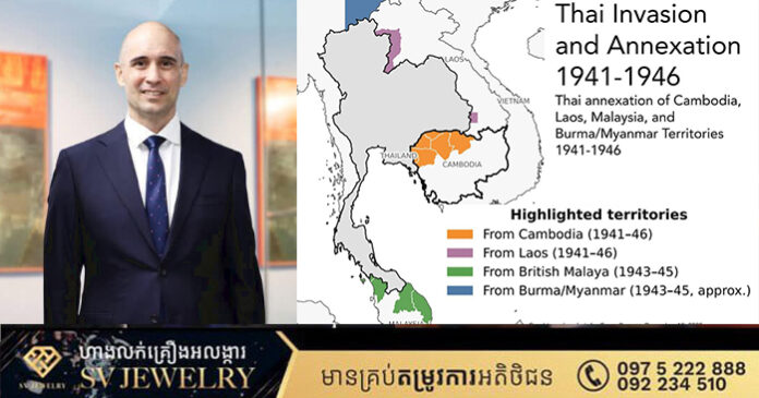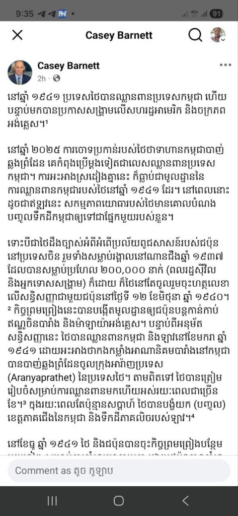 ភ្នំពេញ ៖ លោក Casey Barnett ប្រធានសភាពាណិជ្ជកម្មអាមេរិកប្រចាំកម្ពុជា នៅថ្ងៃទី១៨ ខែធ្នូ ឆ្នាំ២០២៥នេះ បានលើកឡើងថា នៅឆ្នាំ២០២៥នេះ ប្រទេសថៃ បានប្រើលេសឈ្លានពានកម្ពុជាម្តងទៀត គឺស្រដៀងការឈ្លានពានកម្ពុជាកាលពីឆ្នាំ១៩៤១។