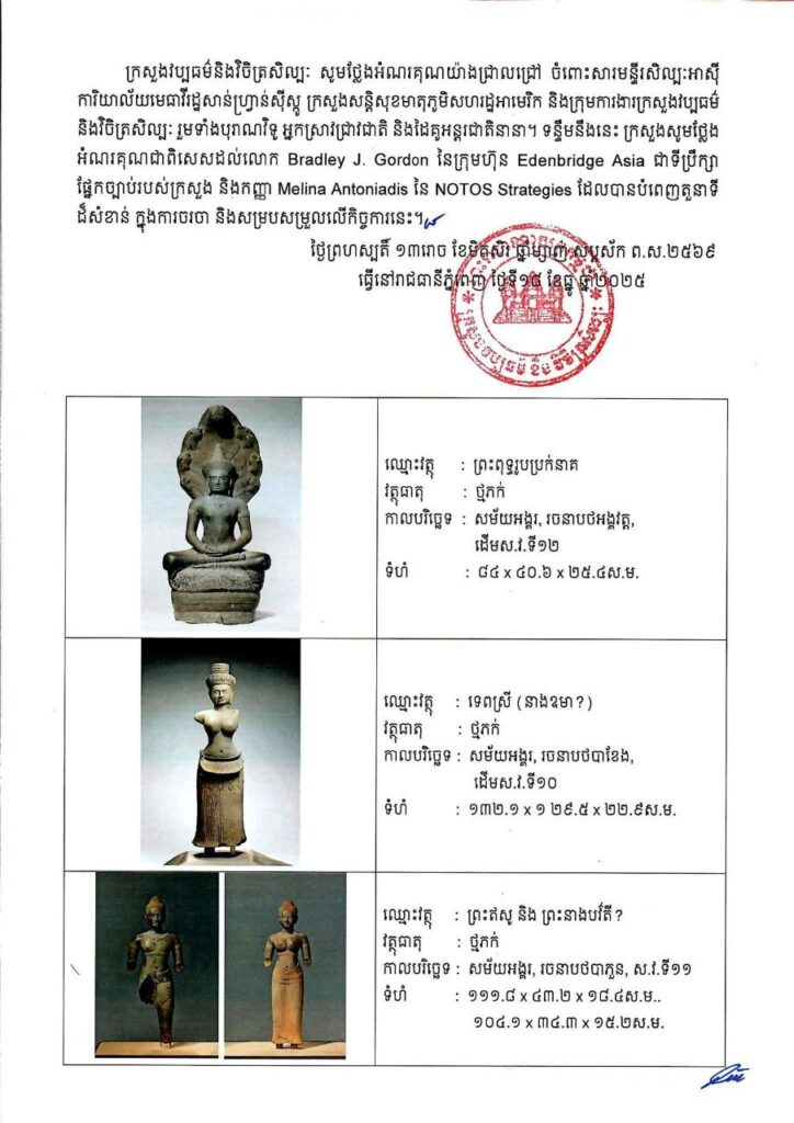 លោកជំទាវបណ្ឌិតសភាចារ្យ ភឿង សកុណា រដ្ឋមន្ត្រីក្រសួងវប្បធម៌និងវិចិត្រសិល្បៈ បានស្វាគមន៍ ចំពោះការសម្រេចចិត្តរបស់សារមន្ទីរសិល្បៈអាស៊ីនេះ ដោយបានថ្លែងថា “វត្ថុដ៏វិចិត្រដែលប្រគល់មកវិញទាំងនេះ គឺជាផ្នែកមួយនៃមរតកវប្បធម៌និងអត្តសញ្ញាណជាតិខ្មែរ ដែលមិនត្រឹមតែជាការស្តារឡើងវិញនូវការចងចាំ ផ្នែកវប្បធម៌ប៉ុណ្ណោះទេ ប៉ុន្តែជាការព្យាបាលស្លាកស្នាមរបួសផ្លូវចិត្ត ដែលបន្សល់មករាប់ទសវត្សរ៍ដោយសារ សង្គ្រាម និងការបាត់បង់បេតិកភណ្ឌវប្បធម៌ជាតិ”។