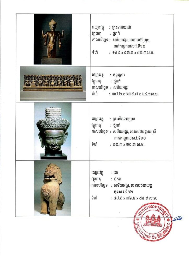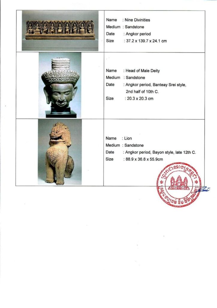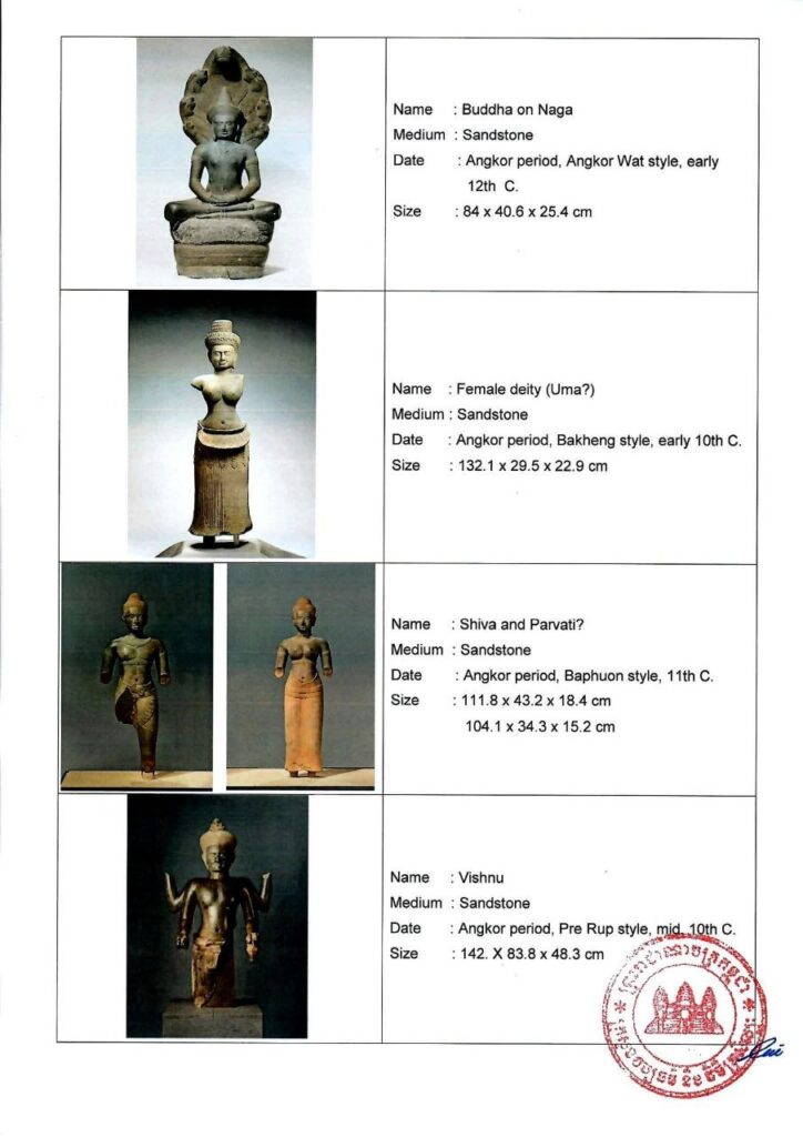 ក្នុងចំណោមវត្ថុទាំង១៣រូបនេះ មានដូចជា៖ បដិមាជាទេវរូប ព្រះសិរទេពប្រុស ចម្លាក់តោ និងចម្លាក់ គ្រឿងបង្គំប្រាសាទនានា។ តាមរយៈការសិក្សាវិភាគលើភស្តុតាង ដោយមន្ត្រីជំនាញសារមន្ទីរ និងក្រុមអ្នកស៊ើប អង្កេតបានបញ្ជាក់ថា វត្ថុទាំងនេះមានជាប់ពាក់ព័ន្ធនឹងបណ្តាញទំនាក់ទំនងជាមួយ លោក ខូក្លាស ឡាតហ្វដ (Douglas Latchford) ដែលបានលួចនាំចេញពីកម្ពុជា ក្នុងអំឡុងសង្គ្រាមស៊ីវិល និងអសន្តិសុខ។