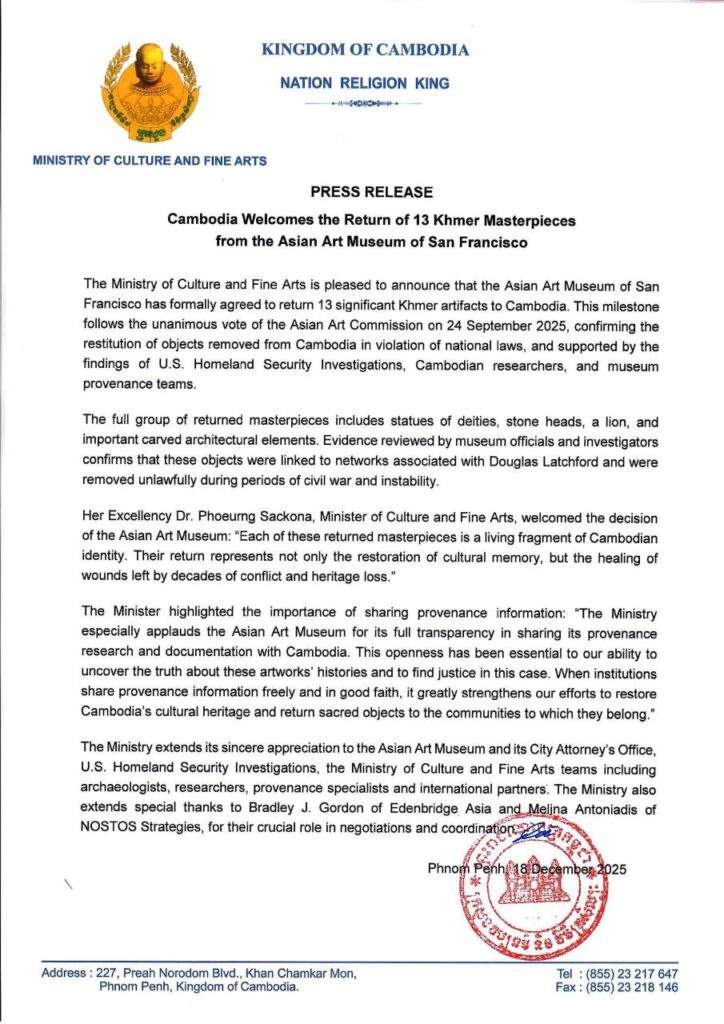 ភ្នំពេញ ៖ ក្រសួងវប្បធម៌និងវិចិត្រសិល្បៈ សូមជម្រាបជូនសាធារណជនជ្រាបថា សារមន្ទីរសិល្បៈអាស៊ីសាន់ហ្រ្វាន់ស៊ីស្កូ សហរដ្ឋអាមេរិក (Asian Art Museum of San Francisco)បានសម្រេចប្រគល់វត្ថុបុរាណខ្មែរចំនួន១៣រូបជូនមក កម្ពុជាវិញ។ការសម្រេចជាផ្លូវការនេះធ្វើឡើងបន្ទាប់ពីគណៈកម្មការសិល្បៈ អាស៊ីបានបោះឆ្នោតយល់ព្រមជាឯកច្ឆន្ទ កាលពីថ្ងៃទី២៤ ខែកញ្ញា ឆ្នាំ២០២៥ ដោយបញ្ជាក់ថា វត្ថុបុរាណខ្មែរដ៏វិចិត្រទាំង៣៣រូប បាននាំចេញពីកម្ពុជាដោយខុសច្បាប់ ដែលជាការបំពានលើច្បាប់សហព័ន្ធ និងផ្អែកលើភស្តុតាងនានាដែលរកឃើញដោយភ្នាក់ងារសន្តិសុខមាតុភូមិសហរដ្ឋអាមេរិក រួមទាំងក្រុមស្រាវ ជ្រាវកម្ពុជា និងក្រុមការងារសារមន្ទីរសិល្បៈអាស៊ី។
