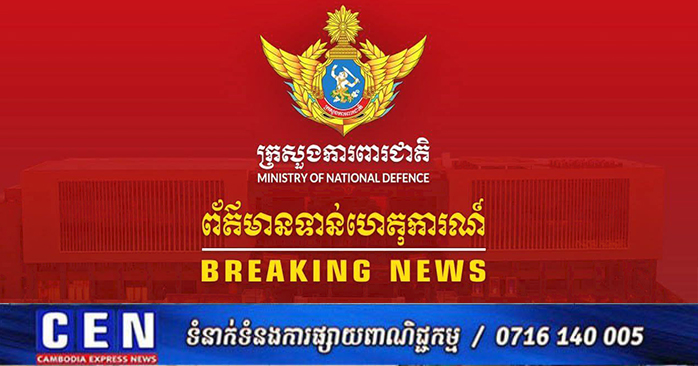 ភ្នំពេញ ៖ ក្រសួងការពារជាតិ សូមជម្រាបជូននូវស្ថានការណ៍នៅតាមបន្ទាត់ព្រំដែនកម្ពុជា-ថៃ អំពី ករណីយោធាថៃបានបន្តធ្វើសកម្មភាពវាយប្រហារមកលើកម្ពុជា នៅយោធភូមិភាគទី៤ ក្នុងភូមិសាស្រ្ត ប្រាសាទព្រះវិហារ ភ្នំខ្មោច ពាក់ស្បែក និង៥មករា ខេត្តព្រះវិហារ នាថ្ងៃទី១៨ ខែធ្នូ ឆ្នាំ២០២៥៖