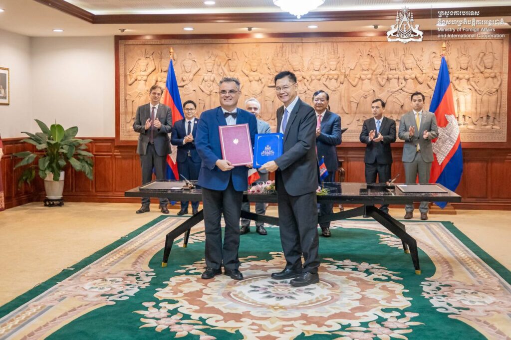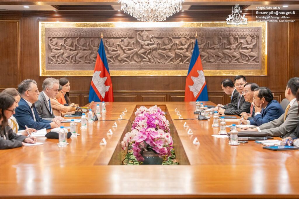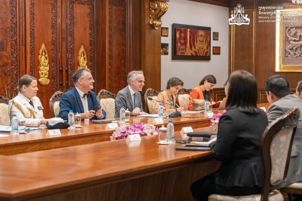 ភ្នំពេញ ៖ នៅព្រឹកថ្ងៃទី១៨ ខែធ្នូ ឆ្នាំ២០២៥ ឯកឧត្តម ប្រាក់ សុខុន ឧបនាយករដ្ឋមន្ត្រី រដ្ឋមន្រ្តីក្រសួងការបរទេស និងកិច្ចសហប្រតិបត្តិការអន្តរជាតិ បានអញ្ជើញទទួលជំនួបសម្តែងការគួរសមរបស់លោក Benoît GUIDÉE ប្រធាននាយកដ្ឋានអាស៊ី និងអូសេអានី នៃក្រសួងអឺរ៉ុប និងការបរទេសនៃសាធារណរដ្ឋបារាំង ដែលបានអញ្ជើញមកកម្ពុជាក្នុងនាមជាសហប្រធាននៃកិច្ចប្រជុំពិគ្រោះយោបល់នយោបាយទ្វេភាគីលើកទី៣ រវាងព្រះរាជាណាចក្រកម្ពុជា និងសាធារណរដ្ឋបារាំង។