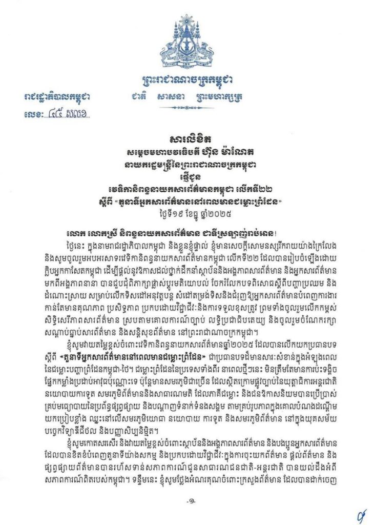 ខ្ញុំសូមកោតសរសើរដោយស្មោះ និងសូមចាត់ទុកនូវបេសកកម្មដ៏មានសារៈសំខាន់របស់បងប្អូន អ្នកសារព័ត៌មាន ជាការរួមចំណែកយ៉ាងសកម្មក្នុងការថែរក្សាសុខសន្តិភាព ស្ថិរភាពនយោបាយ និងការអភិវឌ្ឍ ប្រទេសជាតិប្រកបដោយចីរភាព។ រាជរដ្ឋាភិបាល នីតិកាលទី៧ នៃរដ្ឋសភា បានបន្តប្ដេជ្ញាចិត្តយ៉ាងមុតមាំ ក្នុងការលើកកម្ពស់សិទ្ធិសេរីភាពសារព័ត៌មាន និងភាពជាដៃគូមិនអាចខ្វះបានជាមួយអ្នកសារព័ត៌មានក្នុង ក្របខ័ណ្ឌប្រទេសប្រជាធិបតេយ្យ សេរីពហុបក្ស ស្របតាមរដ្ឋធម្មនុញ្ញ និងច្បាប់នៃព្រះរាជាណាចក្រកម្ពុជា។ ទន្ទឹមនេះ ក្នុងកាលៈទេសៈដែលយើងកំពុងដោះស្រាយបញ្ហាព្រំដែនជាមួយប្រទេសជិតខាង ខ្ញុំសូមអំពាវនាវដល់បងប្អូន អ្នកសារព័ត៌មានជាតិ-អន្តរជាតិ និងអ្នកពាក់ព័ន្ធផ្សេងទៀត សូមរក្សានូវក្រមសីលធម៌ និងវិជ្ជាជីវៈ សារព័ត៌មាន ដោយមិនត្រូវប្រឌិតព័ត៌មានដើម្បីញុះញង់នាំឱ្យកើតមានអរិភាពជាតិសាសន៍ ឬបង្កការយល់ច្រឡំ មកលើគណៈកម្មការព្រំដែន រាជរដ្ឋាភិបាលកម្ពុជា រដ្ឋលេខាធិការដ្ឋានកិច្ចការព្រំដែន និងគណៈកម្មការចម្រុះ ខណ្ឌសីមាព្រំដែនគោកកម្ពុជា ដែលកំពុងអនុវត្តការងារវាស់វែង និងកំណត់បង្គោលព្រំដែនបណ្តោះអាសន្នដោយ ឈរលើមូលដ្ឋានច្បាប់អន្តរជាតិ អនុសញ្ញា សន្ធិសញ្ញា ផែនទីនិងឯកសារដែលបន្សល់ទុកពីបារាំង។